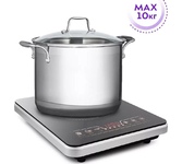 Мощность 2000 Вт. Управление сенсорное. Количество программ 1. Ступеней мощности 20. Таймер до 24 ч с шагом +10 минут/- 1 минута. Длина шнура 1,4 м. Диаметр нагревателя 210 мм. Размер устройства 285 х 365 х 67 мм.