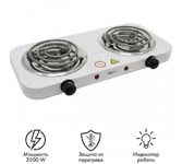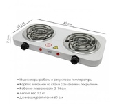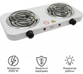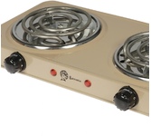 Номинальная потребляемая мощность 2000 Вт. Количество конфорок 2 штуки. Эмалированная рабочая поверхность. Цвет эмали: бежевый. Спиралевидные электроконфорки. Поворотные механические переключатели. Световой индикатор работы. Терморегулятор. Ножки - 4 штуки.