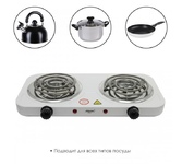 Мощность: 1000 Вт + 1000Вт Размер конфорки: 140 мм+140 мм Материал конфорки: ТЭН Световой индикатор работы Защита от перегрева Состав: металл, пластик, кабель