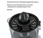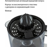 Соковыжималка для цитрусовых, Объем 0,8 л., Мощность 30 Вт., 2 сменные насадки-конуса для фруктов разного размера, Прозрачная крышка для защиты от пыли, Прорезиненные ножки, Пластиковый корпус с декором из нержавеющей стали, Легко разбирать и мыть