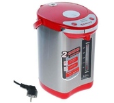 5,0 л, 750 Вт, повторное кипячение, поддержание температуры, 3 способа подачи воды (помпой, кнопкой на панели, нажатием чашкой), колба нерж.сталь. Цвет: металлик + красный.