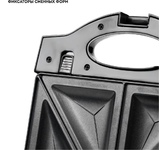 Мощность 800Вт. Термоизоляционный корпус. 3 сменные двойные формы для приготовления тостов и сэдвичей, Венских вафель, блюд на гриле. Фиксаторы сменных форм. Антипригарное покрытие рабочей поверхности. Индикаторы сети и нагрева.