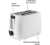 Номинальная потребляемая мощность 750 Вт, Количество тостов 2 штуки, Выдвигающийся поддон для сбора крошек, Отсек для хранения шнура, Регулирование степени поджаривания тостов, 7-позиционный таймер, Режим «Подогрев», Режим «Разморозка», Функция автоцентрирования, Функция отмены.