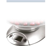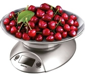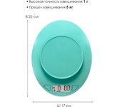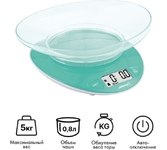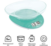 Максимальный вес 5 кг, цена деления 1 г, функция «Тара», взвешивание продуктов и определение объема жидкости, платформа из пластика, нескользящие ножки, съёмная чаша 2 л в комплекте, питание 3В (2 батарейки ААА в комплект не входят)