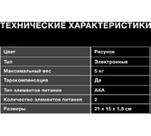 Материал платформы: стекло с полноцветным рисунком Максимальный вес: 5 кг, Цена деления: 1 г Питание: 1 * CR2032 -автоматическое отключение, тарокомпенсация