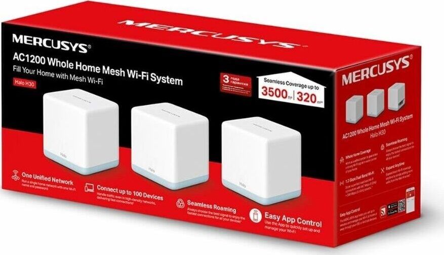 MERCUSYS Бесшовный Mesh роутер Halo H30, Wi-Fi 5, AC1200, 2.4/5ГГц, 2 WAN/LAN, белый, 3 шт. в компле