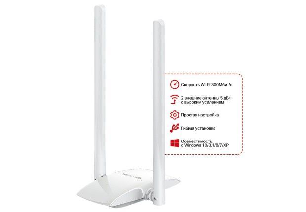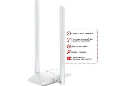 Адаптер высокого усиления, две 5 дБи высокочувствительные антенны, гибкая установка с USB кабелем, поддержка Windows 10/8.1/8/7/XP(32/64 bit). интерфейс: USB 2.0; диапазоны Wi-Fi: 2.4ГГц. Современный сетевой адаптер WiFi от торговой марки Mercusys модель MW300UH представляет собой компактное устройство. Он предназначен для подключения к компьютеру или ноутбуку через USB-порт, чтобы обеспечить подключение скоростного интернета. Он прекрасно подойдет для загрузки файлов в большом объеме, а также станет идеальным решением дляонлайн-игрили загрузки HD-видео. Поддерживает различные стандарты Wi-Fi и совместим со всеми версиями Windows.