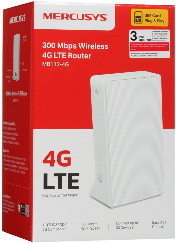 Входной интерфейс: 10/100BASE-TX/3G/4G. Количество выходных портов 10/100BASE-TX: 2. Предназначено для установки: в помещениях. Вес товара: 450. Количество диапазонов: однодиапазонный. Цвет: белый. Максимальная скорость по всем WiFi диапазонам: 300. Количество внутренних и внешних антенн: 2. Тип антенн: внутренние. Скорость 802.11n, 2.4 ГГц: 300. Встроенный модем: 3G/4G. Класс WiFi: N300. Категория LTE: cat. 4. Тип SIM-карты: nano SIM. Комплектация: Роутер, адаптер питания, кабель Ethernet RJ45, краткое руководство по установке.. Габариты упаковки (ед) ДхШхВ: 0.13x0.11x0.21. Вес упаковки (ед): 0.56. Страна производства: Китай. Влажность воздуха при эксплуатации: 10-90% без конденсата. Диапазоны частот: 2.4. Кол-во портов LAN: 1. Кол-во портов WAN/LAN: 1. Количество одновременно работающих диапазонов: 1. Количество одновременно работающих устройств по Wi-Fi: 32. Рабочая температура: от 0 до +40. Скорость передачи по проводному подключению (LAN) (макс.): 100. Мобильное приложение: MERCUSYS. Мощность передатчика
