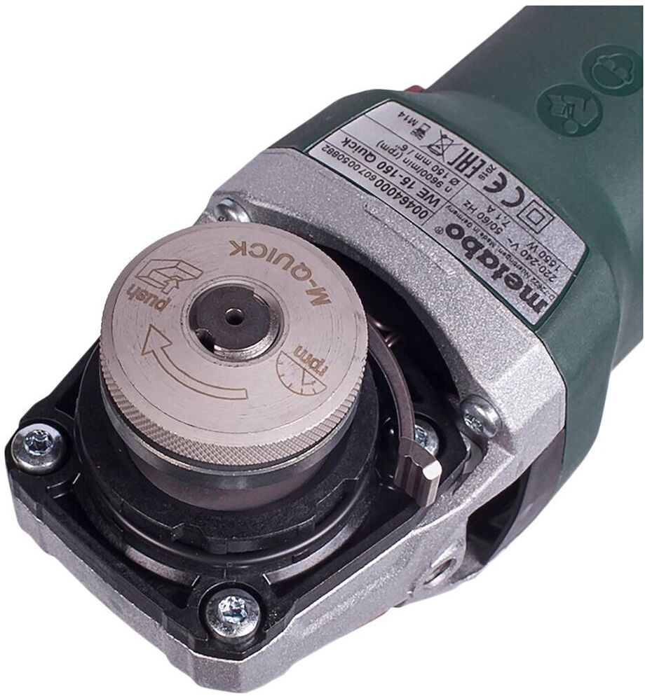 Мощность: 1550. Выходная мощность: 940. Регулировка частоты оборотов: есть. Диаметр шлифовального круга: 125. Резьба шпинделя: M14. Система гашения вибрации: есть. Блокировка шпинделя: есть. Плавный пуск: есть. Защита от непреднамеренного включения: есть. Поворот рабочей головки: есть. Вес товара: 2.5. Комплект поставки: Углошлифовальные машины, защитный кожух, опорный фланец, зажимная гайка M-Quick, дополнительная рукоятка Metabo VibraTech (MVT).. Тип электропитания: от электросети. Габариты упаковки (ед) ДхШхВ: 0.387x0.14x0.12. Вес упаковки (ед): 3.36. Тип электрического двигателя: щеточный. Кейс в комплекте: нет. Бесключевая замена оснастки: есть. Датчик падения: нет. Защита двигателя от перегрева: есть. Класс инструмента: профессиональный. Общее количество рукояток: 2. Поддержание постоянных оборотов под нагрузкой: есть. Посадочный диаметр: 22.2. Предохранительная муфта: есть. Рукоятка с мягкой накладкой: нет. Система быстрого доступа к щеткам: нет. Фиксация включенного состояния для непрерывной работы: е