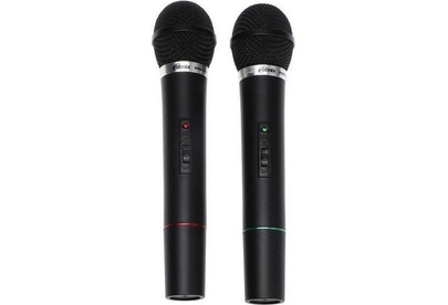Беспроводная микрофонная система VHF-диапазона с двумя микрофонами в комплекте, мощность радиопередатчика - 8 мВт, диапазон частот радиосоединения 87,5—92 МГц, количество каналов в диапазоне 2, тип микрофона - динамический, воспринимаемый диапазон -частот 100–10000 Гц, чувствительность микрофона -30±3 дБ, импеданс микрофона - 600 Ом, индикация заряда, размеры - 305 х 110 х 35 мм.