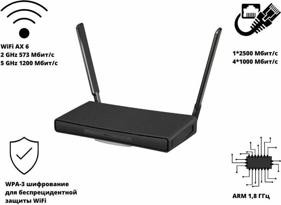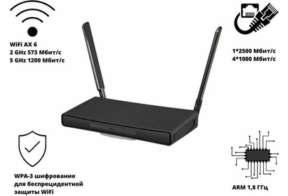 Входной интерфейс: 10/100/1000BASE-TX. Кол-во портов USB 2.0: 1. Предназначено для установки: в помещениях. Вес товара: 800. Количество выходных портов 10/100/1000BASE-TX: 4. Кол-во портов WAN: 1. Количество диапазонов: двухдиапазонный. Цвет: черный. Кол-во портов USB 3.0: 1. Название процессора: IPQ-6010. Частота процессора: 1800. Количество ядер процессора: 4. Оперативная память: 1024. Флеш-память: 128. Максимальная скорость по всем WiFi диапазонам: 1774. Количество внутренних и внешних антенн: 2. Тип антенн: внешние, съемные. Класс WiFi: AX1800. Скорость 802.11ax, 2.4 ГГц: 574. Скорость 802.11ax, 5 ГГц: 1200. Количество выходных портов 100/1000/2.5GBASE-T: 1. Габариты упаковки (ед) ДхШхВ: 0.38x0.19x0.055. Вес упаковки (ед): 1.1. Диапазоны частот: 2.4/5. Кол-во портов LAN: 4. Количество одновременно работающих диапазонов: 2. Многопотоковая передача данных: MU-MIMO. Рабочая температура: от -40 до +70. Скорость передачи по проводному подключению (LAN) (макс.): 1000. Скорость передачи по проводному подключению