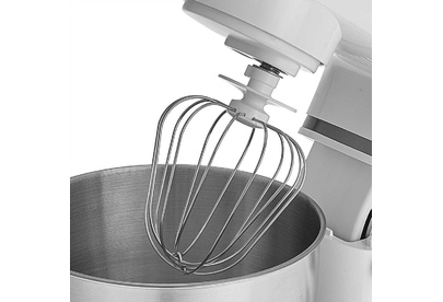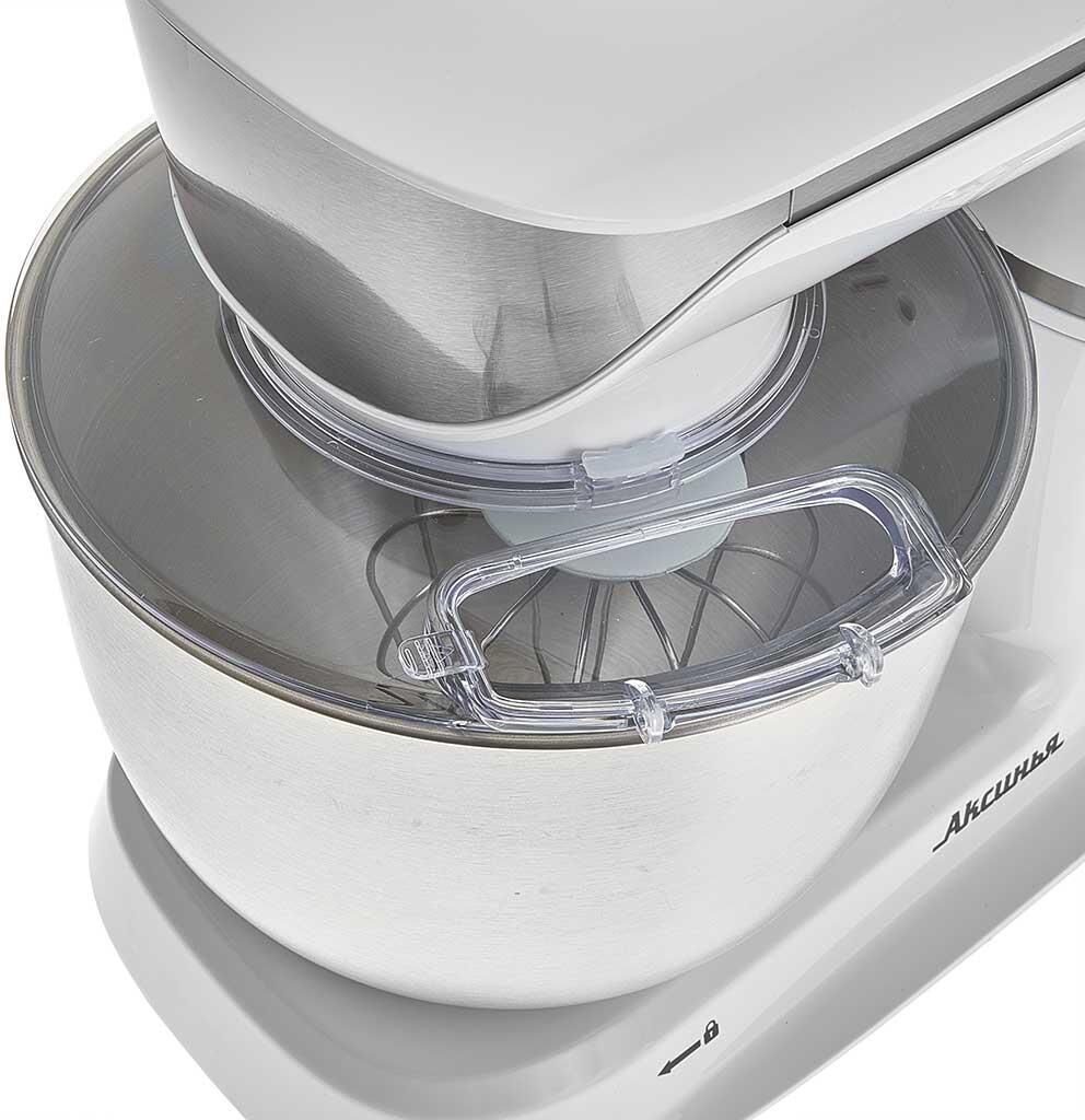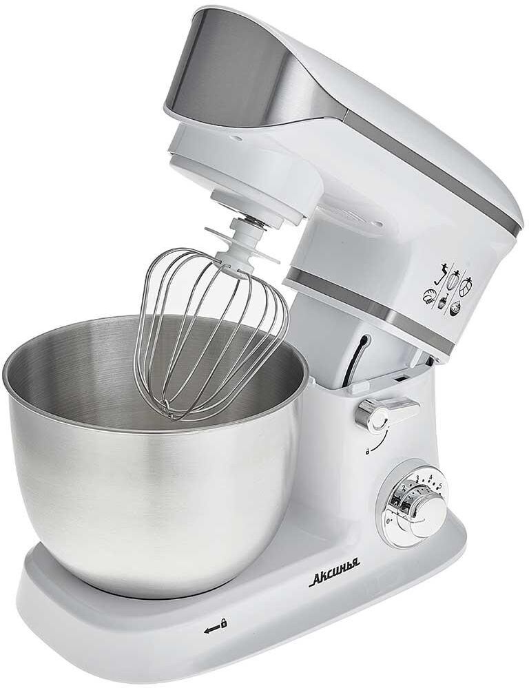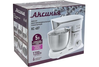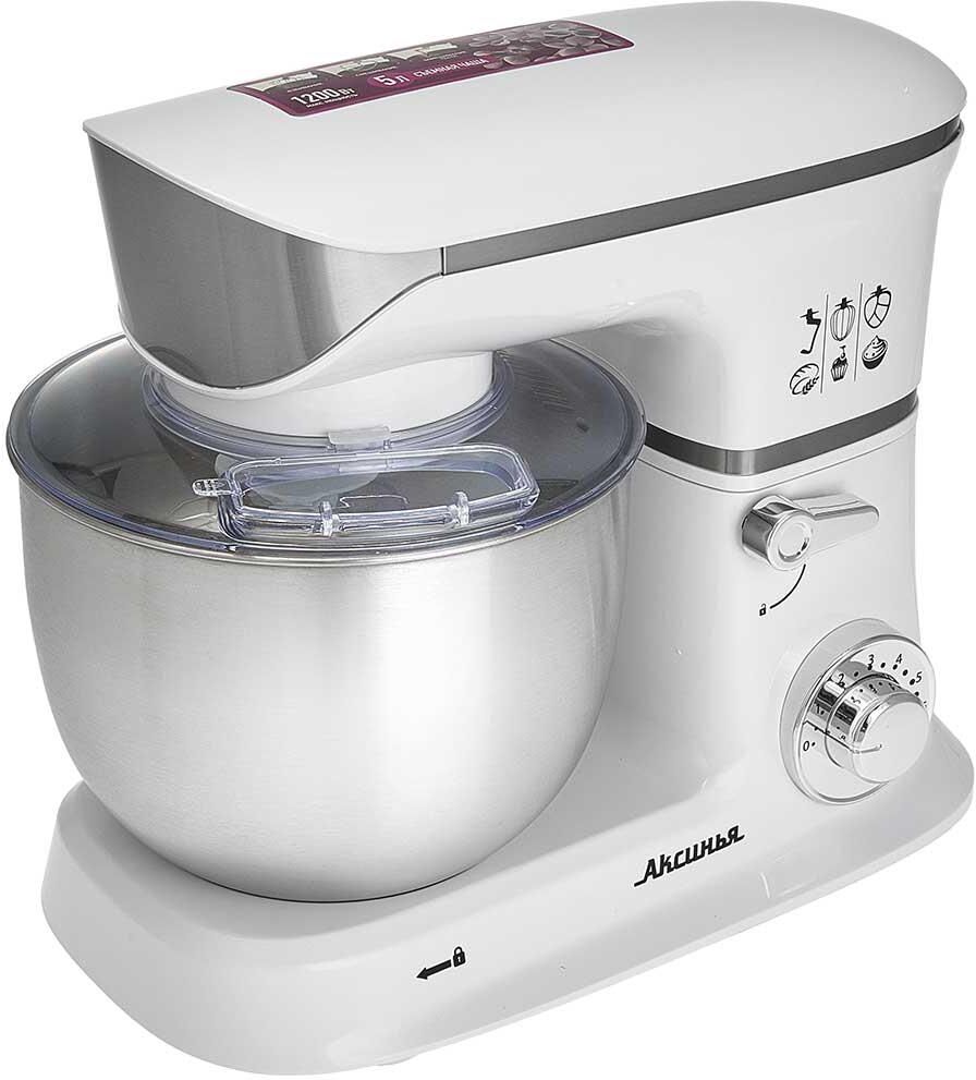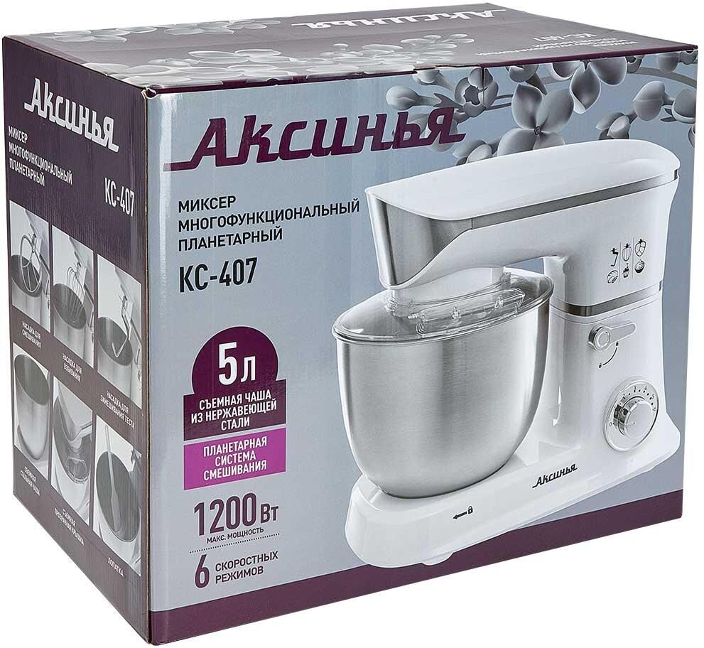 Номинальная потребляемая мощность 1200 Вт, Объем чаши 5 л, Планетарная система смешивания: миксер оснащен уникальной технологией «планетарного» движения, когда венчик совершает обороты в одну сторону, а привод в это время движется по кругу в другую сторону, позволяет осуществлять перемешивание по всему объему чаши, Цвет: белый, Съемная чаша из нержавеющей стали, Съемная прозрачная крышка чаши, Насадки: насадка для смешивания, насадка для замешивания теста, венчик для взбивания яиц и кремов, Лопатка, Противоскользящие ножки, 6 скоростных режимов, Плавная регулировка скоростей, Контроль наклона миксера, Автоматическая блокировка при неправильной установке.