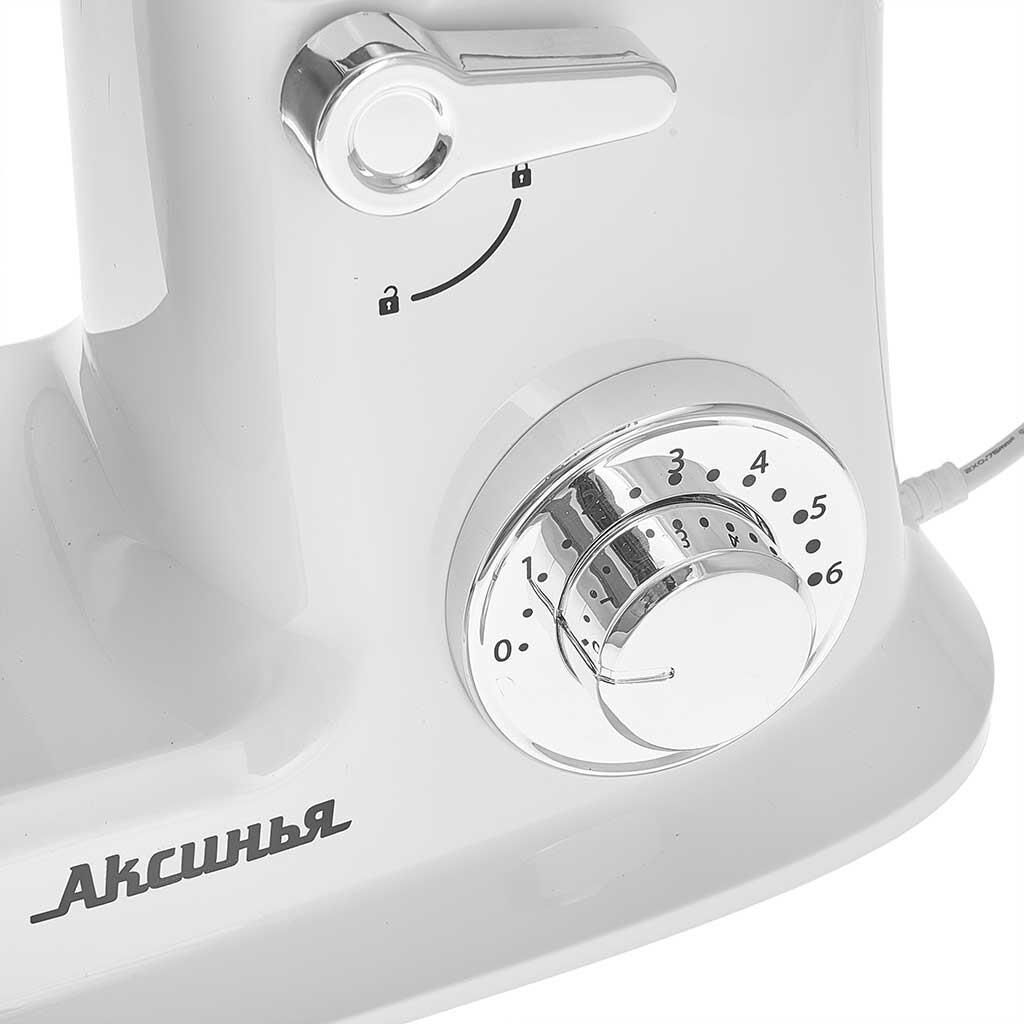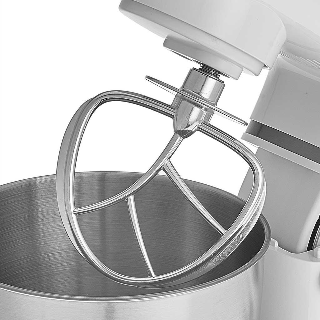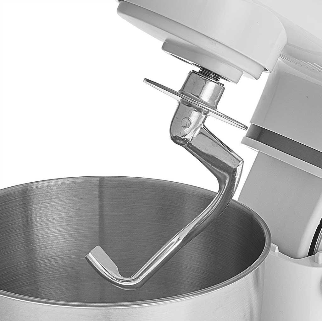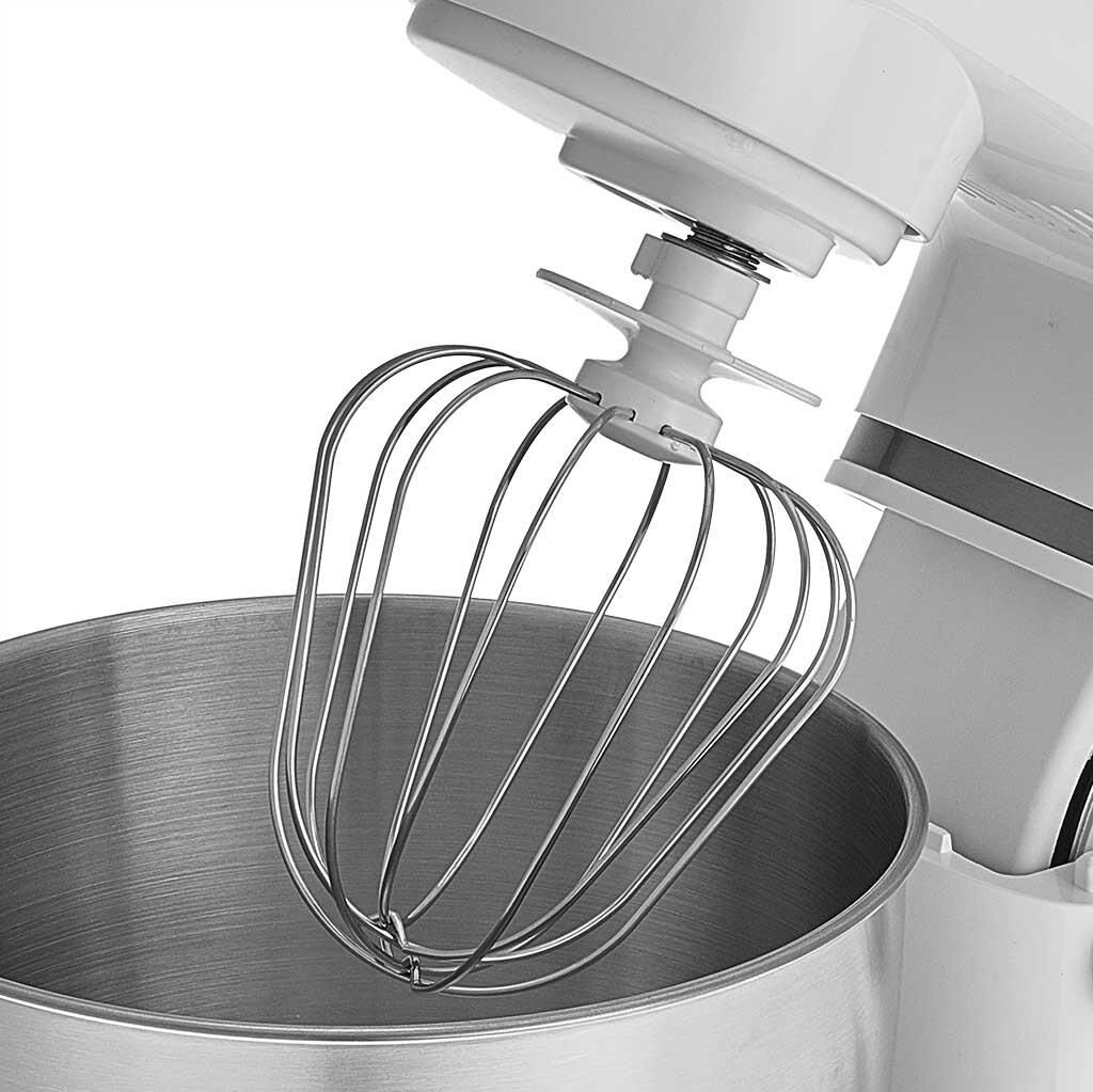 Номинальная потребляемая мощность 1200 Вт, Объем чаши 5 л, Планетарная система смешивания: миксер оснащен уникальной технологией «планетарного» движения, когда венчик совершает обороты в одну сторону, а привод в это время движется по кругу в другую сторону, позволяет осуществлять перемешивание по всему объему чаши, Цвет: белый, Съемная чаша из нержавеющей стали, Съемная прозрачная крышка чаши, Насадки: насадка для смешивания, насадка для замешивания теста, венчик для взбивания яиц и кремов, Лопатка, Противоскользящие ножки, 6 скоростных режимов, Плавная регулировка скоростей, Контроль наклона миксера, Автоматическая блокировка при неправильной установке.