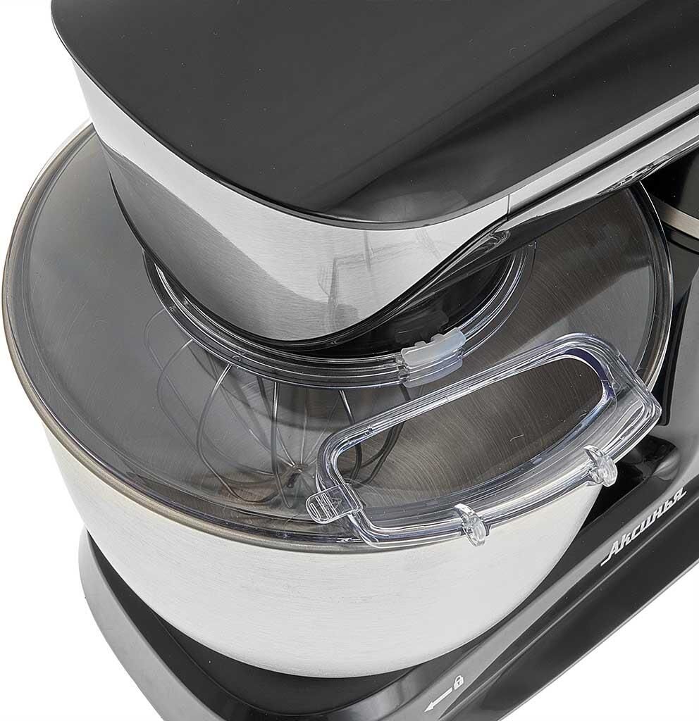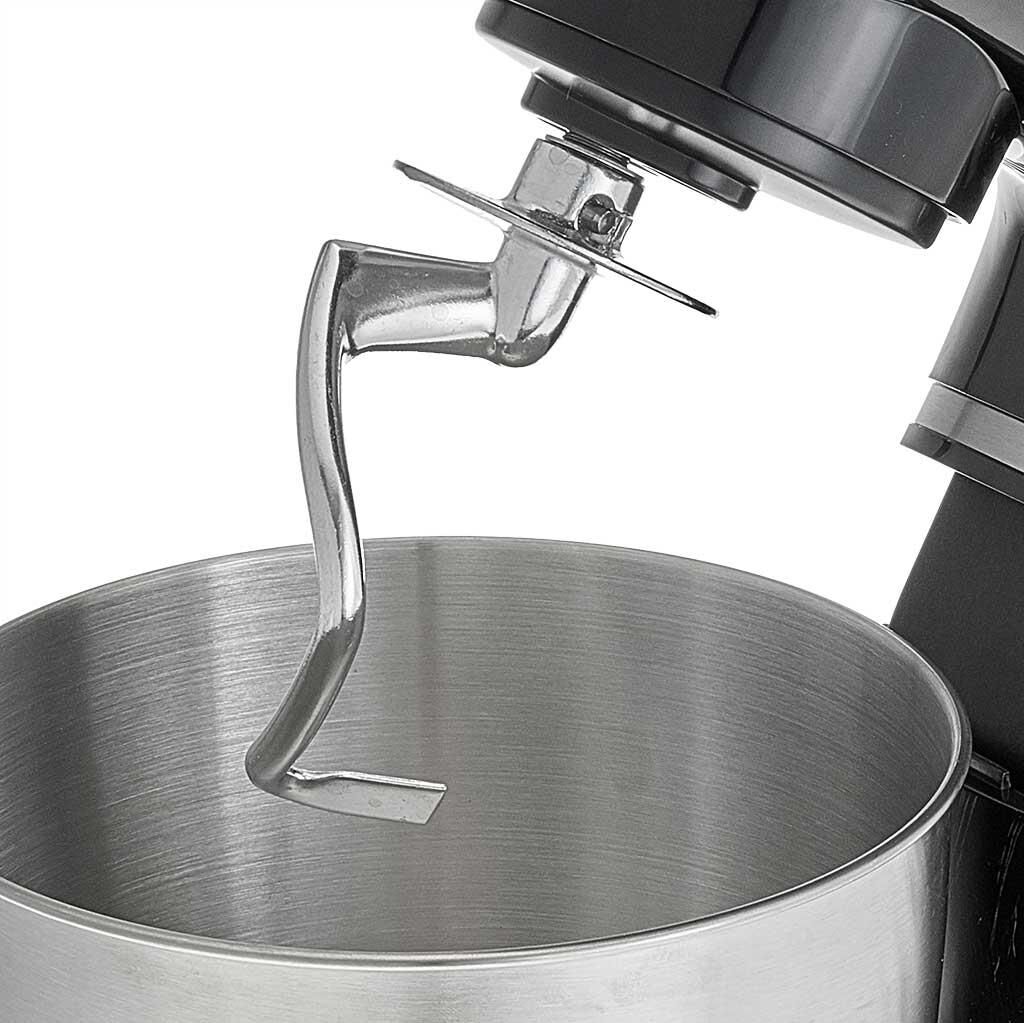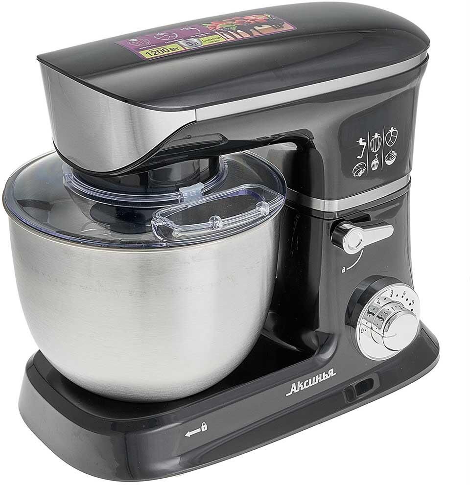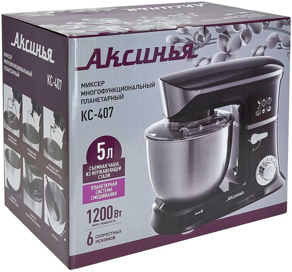 Номинальная потребляемая мощность 1200 Вт, Объем чаши 5 л, Планетарная система смешивания: миксер оснащен уникальной технологией «планетарного» движения, когда венчик совершает обороты в одну сторону, а привод в это время движется по кругу в другую сторону, позволяет осуществлять перемешивание по всему объему чаши, Цвет: черный, Съемная чаша из нержавеющей стали, Съемная прозрачная крышка чаши, Насадки: насадка для смешивания, насадка для замешивания теста, венчик для взбивания яиц и кремов, Лопатка, Противоскользящие ножки, 6 скоростных режимов, Плавная регулировка скоростей, Контроль наклона миксера, Автоматическая блокировка при неправильной установке.