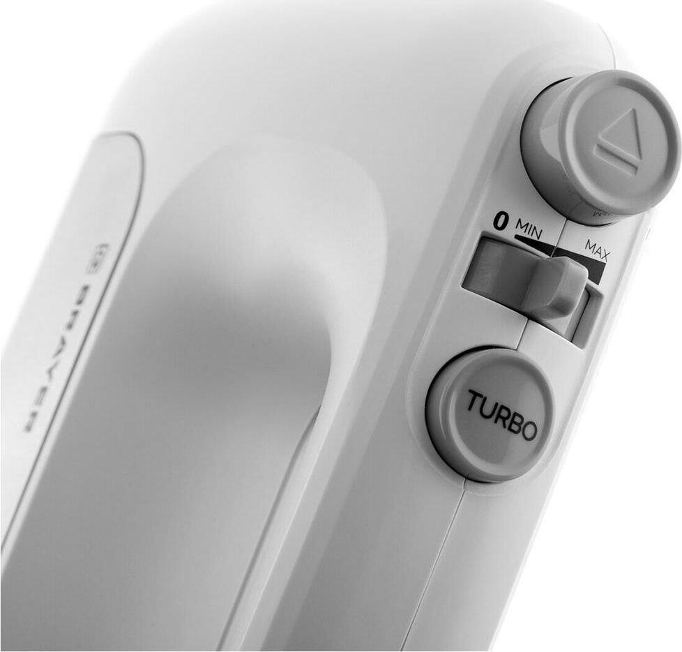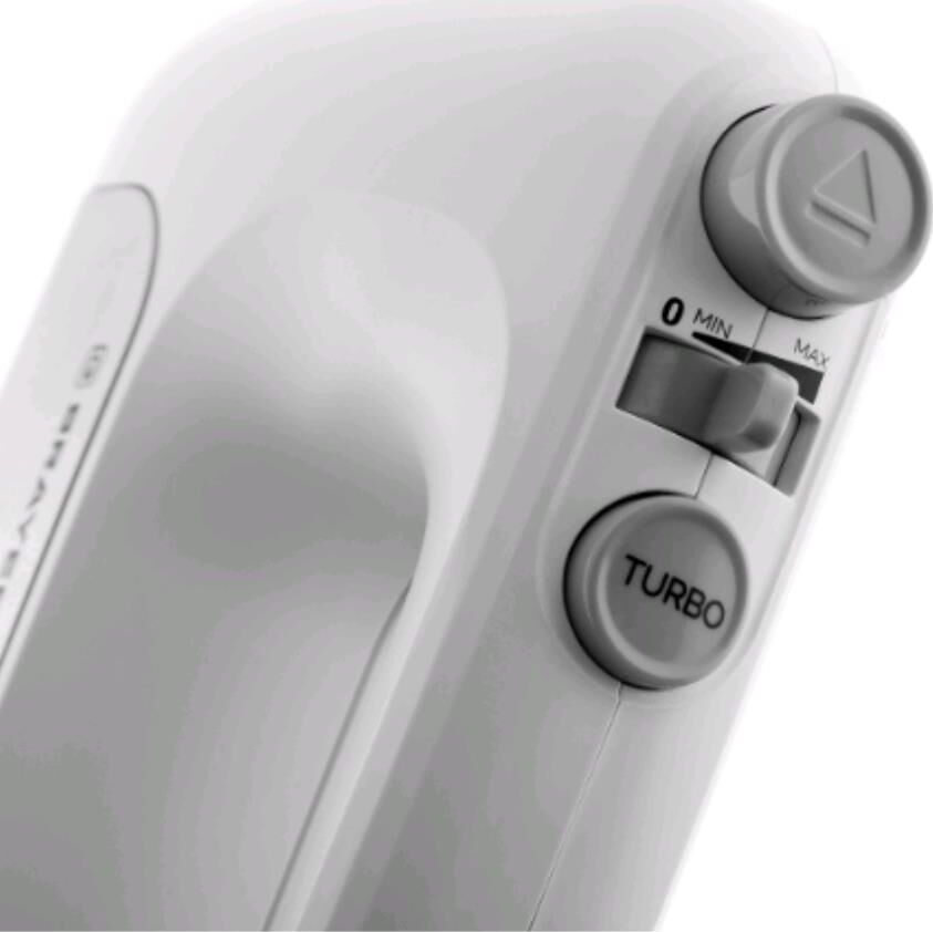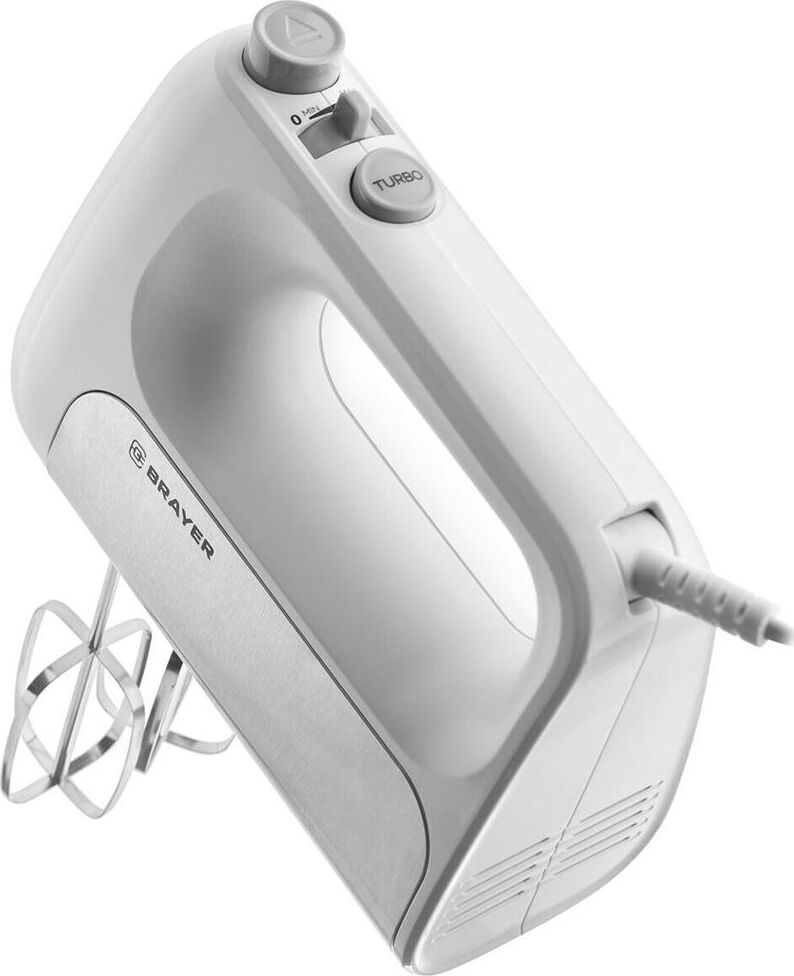 1303BR Миксер BRAYER, 500 Вт, корп.из нерж.стали, 5 режимов, 2 крюка, 2 венчика Мощность 500 Вт. 5 скоростных режимов 2 венчика для взбивания 2 крюка для замешивания теста Турборежим Кнопка для освобождения насадок