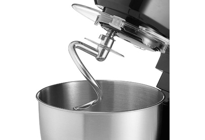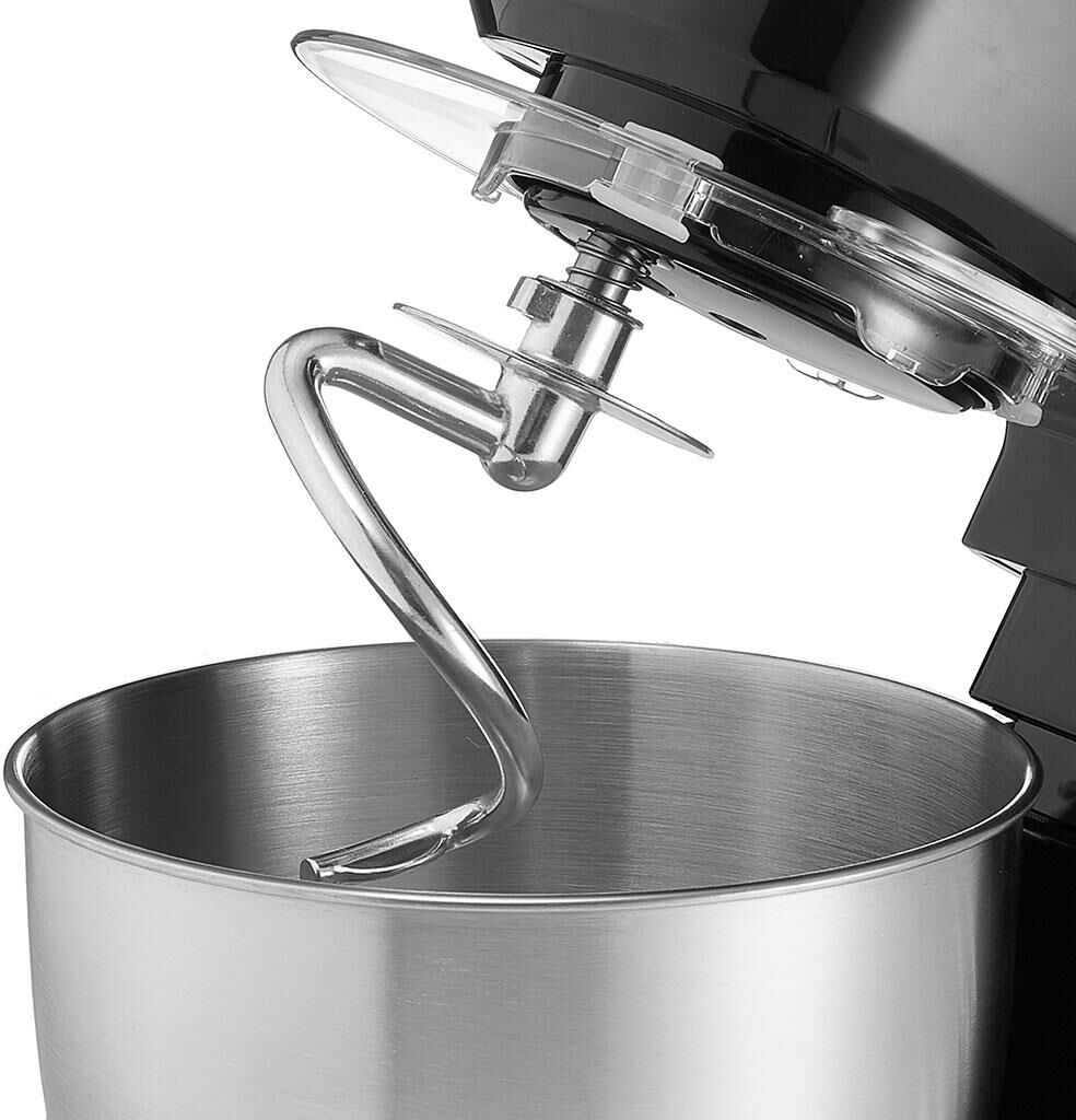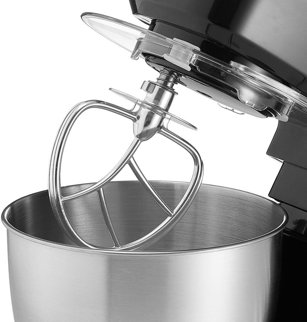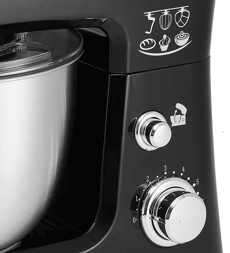 Номинальная потребляемая мощность 1000 Вт, Объем чаши 3,5 л, Планетарная система смешивания: миксер оснащен уникальной технологией «планетарного» движения, когда венчик совершает обороты в одну сторону, а привод в это время движется по кругу в другую сторону, позволяет осуществлять перемешивание по всему объему чаши, Многофункциональный: с его помощью можно взбивать коктейли, замешивать тесто, готовить картофельное пюре и разнообразные кондитерские изделия, Цвет: черный, Съемная чаша из нержавеющей стали, Съемная прозрачная крышка с отверстием для добавления продуктов.