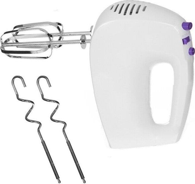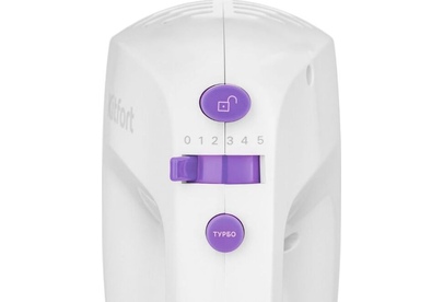 Тип ручной. Мощность 250 Вт. Количество скоростей 5. Турборежим есть. Венчик для взбивания есть. Крюки для теста есть. Цвет белый и фиолетовый.