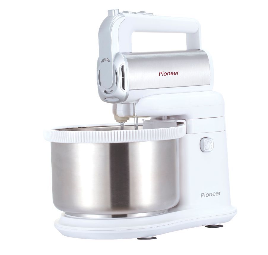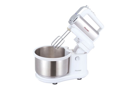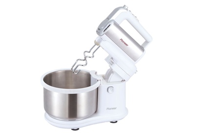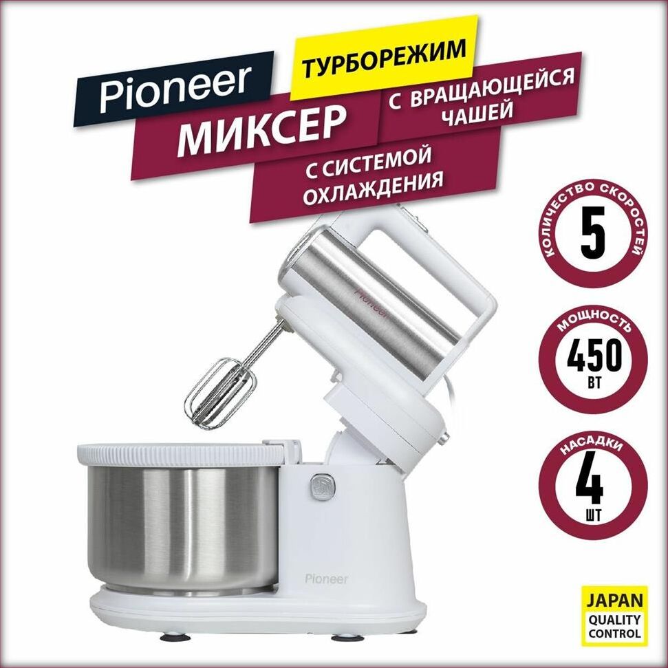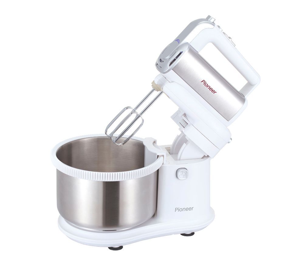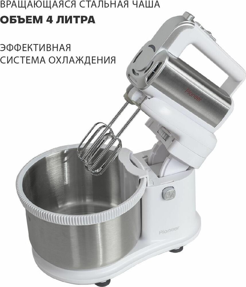 Миксер 2 в 1, ручной + стационарный, максимальная мощность 450 ватт, объем чаши 4 литра, автоматическая вращающаяся чаша, 5 скоростей, режим - Турбо, пониженный уровень шума, веньчики для взбивания яиц и крема, крючки для замеса теста