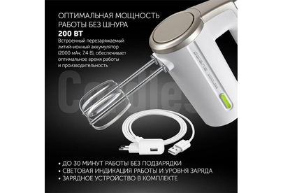 Мощность, 200 Вт.Количество скоростей 3.Технология PROtect+ двойная защита двигателя (от перегрева и перегрузки) обеспечивает надежность и долговечность. Беспроводная технология обеспечивает полную свободу действий на кухне. До 30 минут автономной работы.Время зарядки аккумулятора 5 часов. 3 скоростных режима.Кнопка высвобождения насадок.Дополнительная защита от перегрузки.Световая индикация работы и уровня зарядки.Венчик для взбивания из нержавеющей стали.2 венчика для перемешивания из нержавеющей стали. Подставка для хранения.Аккумулятор: Li-ion 2000 мАч, 7,4 В.Зарядное устройство: Входное напряжение: 100-240 В.