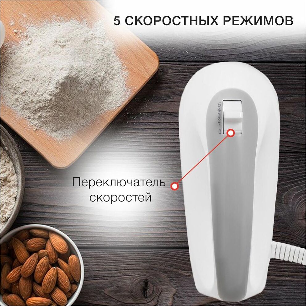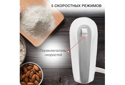 Тип ручной Мощность 250 Вт Количество скоростей 5 Венчик для взбивания Крюки для теста Цвет миксера белый/серый Габариты упаковки (ед) ДхШхВ 0.21x0.1x0.33 м Срок гарантии 12 мес.