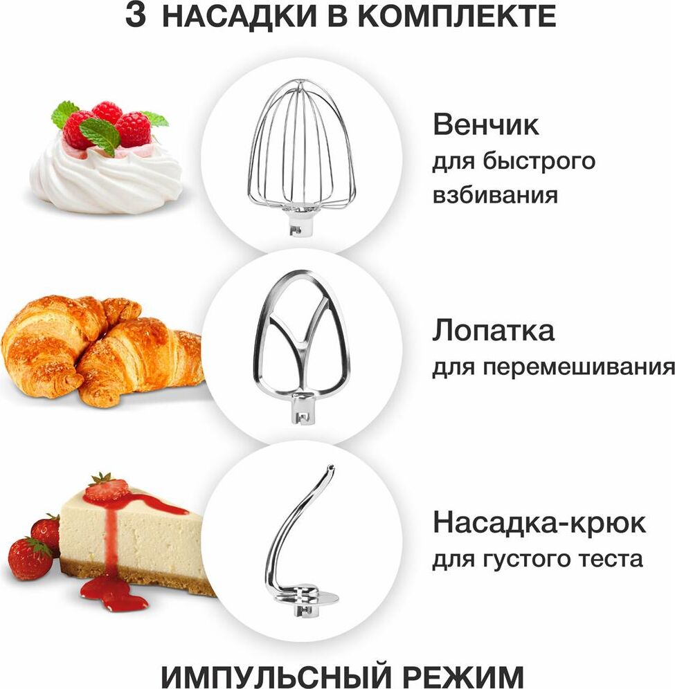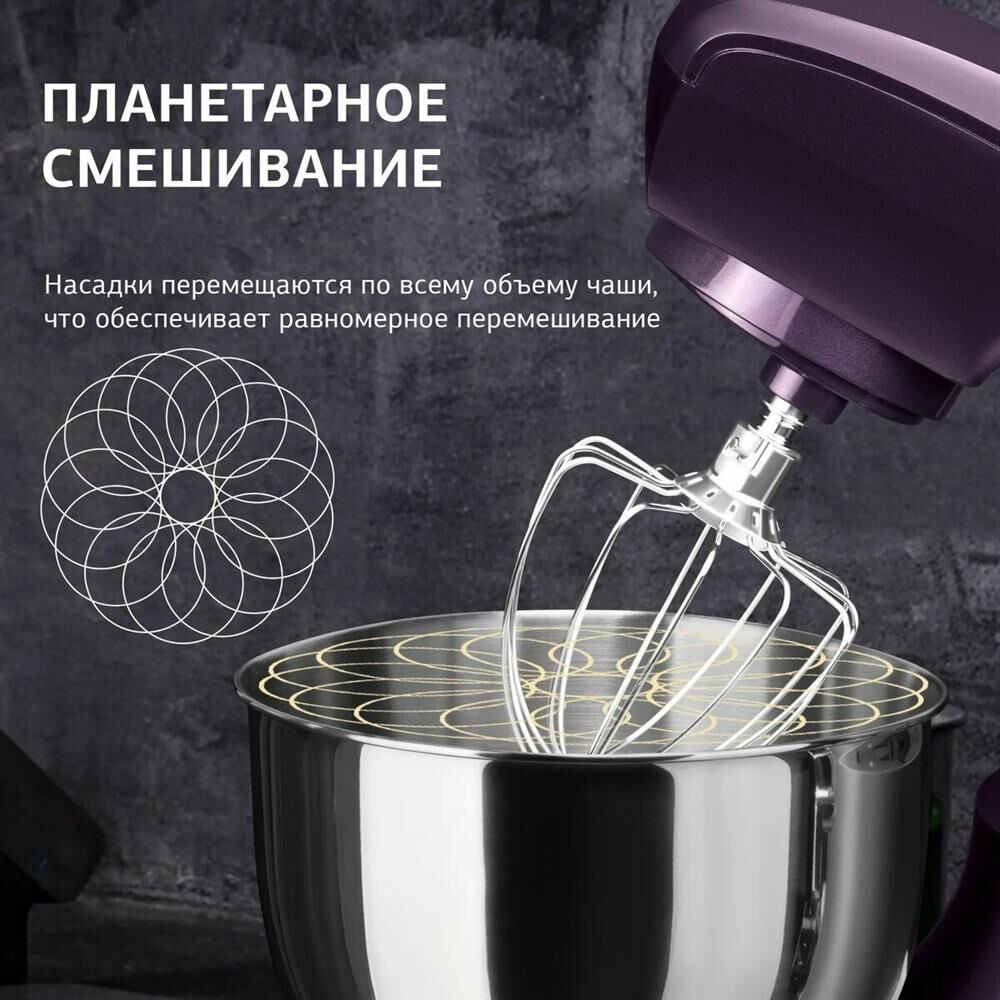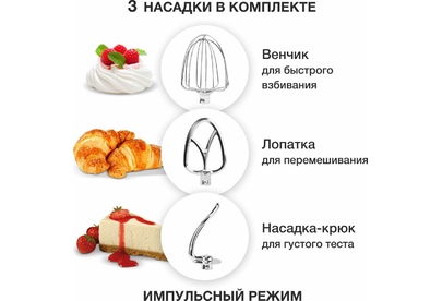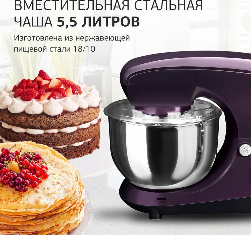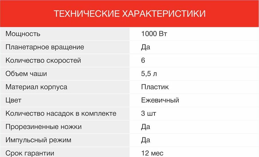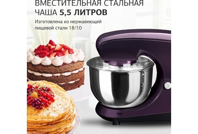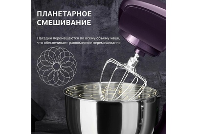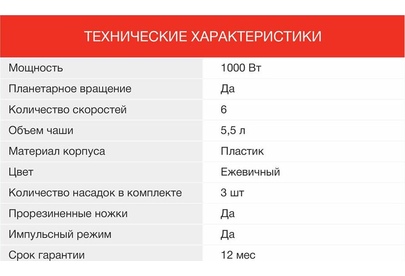 Мощность 1000 Вт Планетарное вращение ДА Количество скоростей 6 Объем чаши 5.5 л Количество насадок в комплекте 3 шт Прорезиненные ножки ДА
