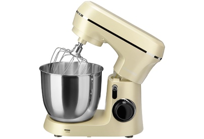 1300 Вт 8 скоростей, импульсный режим. В комплект входит венчик для взбивания, крюки для теста,лопатка для перемешивания, защитный обод 3 насадки Материал чаши — нержавеющая сталь Ёмкость чаши 4,5 л Прорезиненные ножки Цвет бежевый Срок гарантии 12 мес