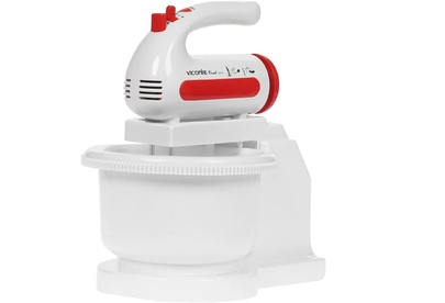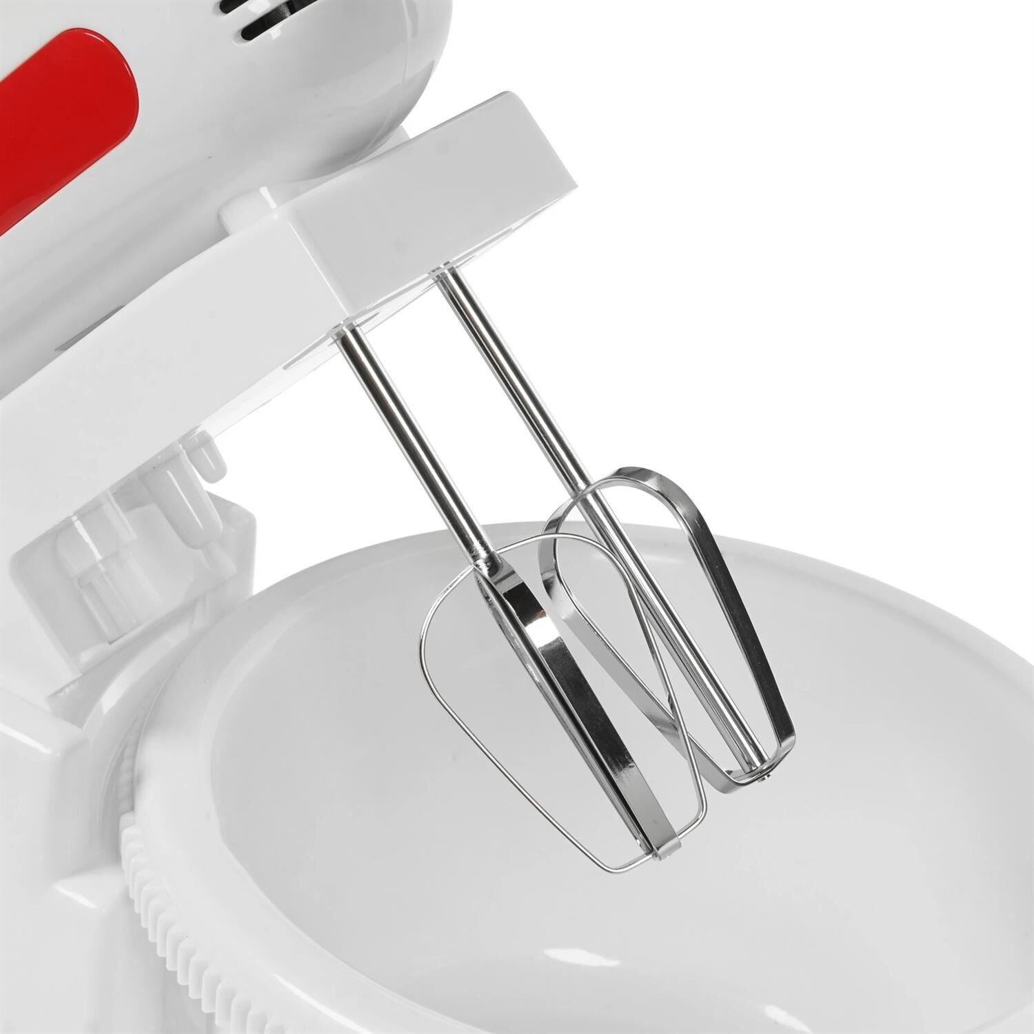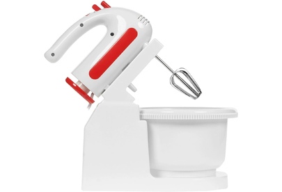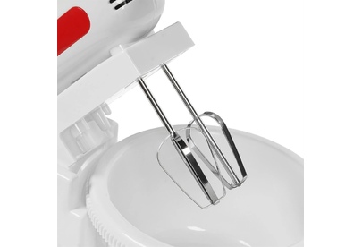 Миксер с вращающейся чашей, 300W, 5 скоростей работы, кнопка извлечения насадок, двойной набор насадок: два венчика для взбивания яиц и кремов, две насадки для размешивания тяжелого теста, смешивание жидкостей, замешивание теста, приготовление пюре, взбивание сливок и белков.