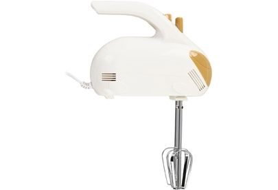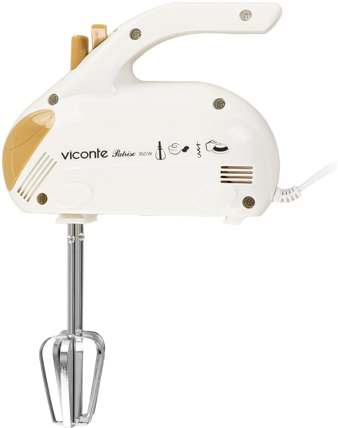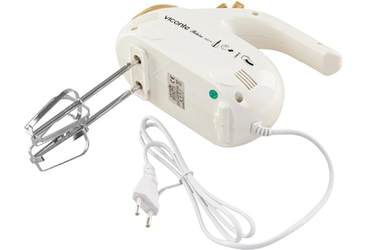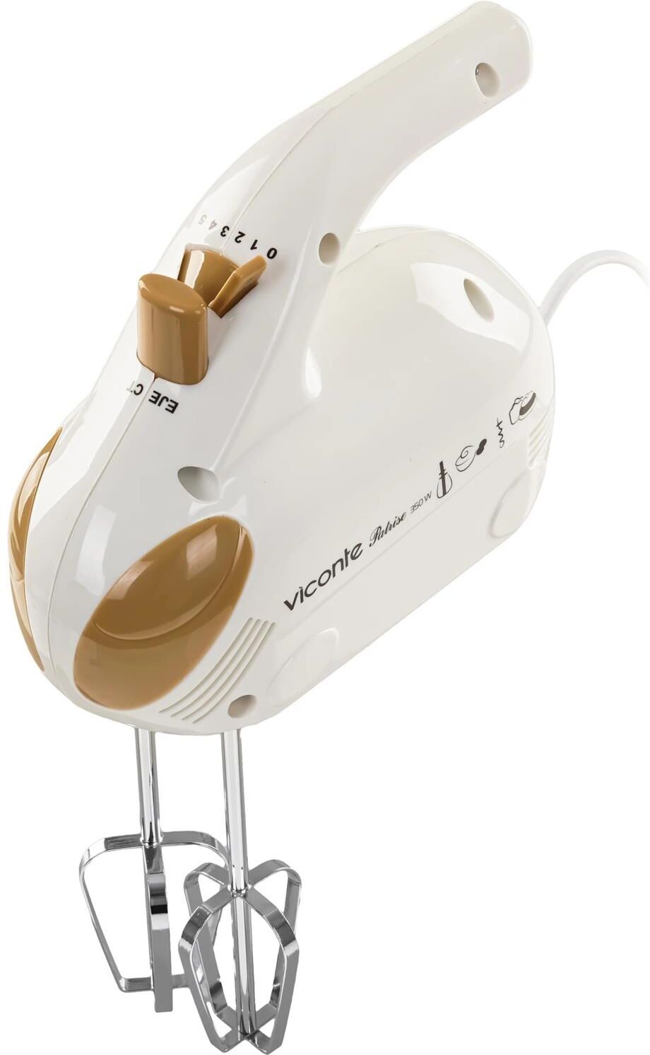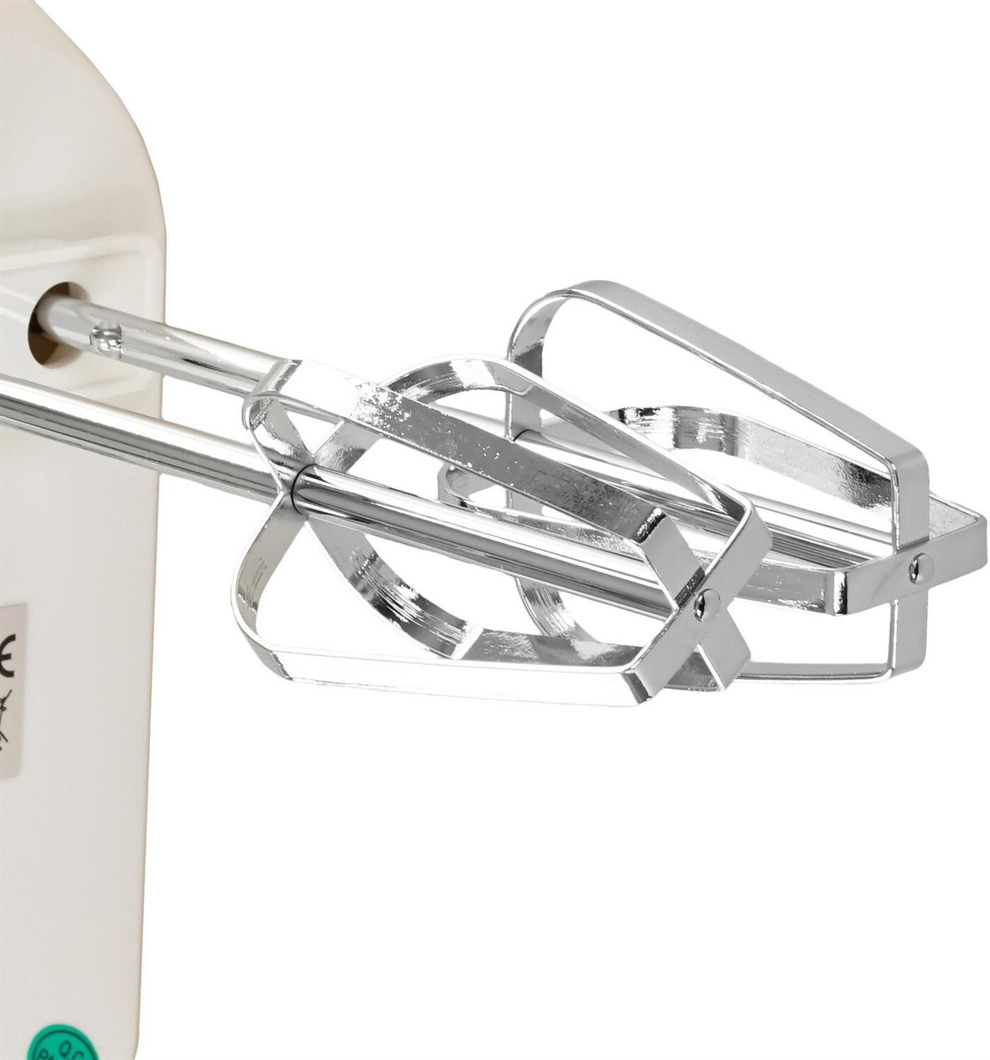 Миксер, 350W, 5 скоростей работы, кнопка извлечения насадок, двойной набор насадок: два венчика для взбивания яиц и кремов, две насадки для размешивания тяжелого теста, смешивание жидкостей, замешивание теста, приготовление пюре, взбивание сливок и белков
