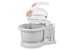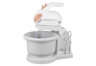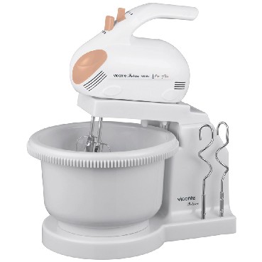 Миксер с вращающейся чашей, 350W, 5 скоростей работы, кнопка извлечения насадок, двойной набор насадок: два венчика для взбивания яиц и кремов, две насадки для размешивания тяжелого теста, смешивание жидкостей, замешивание теста, приготовление пюре, взбивание сливок и белков.