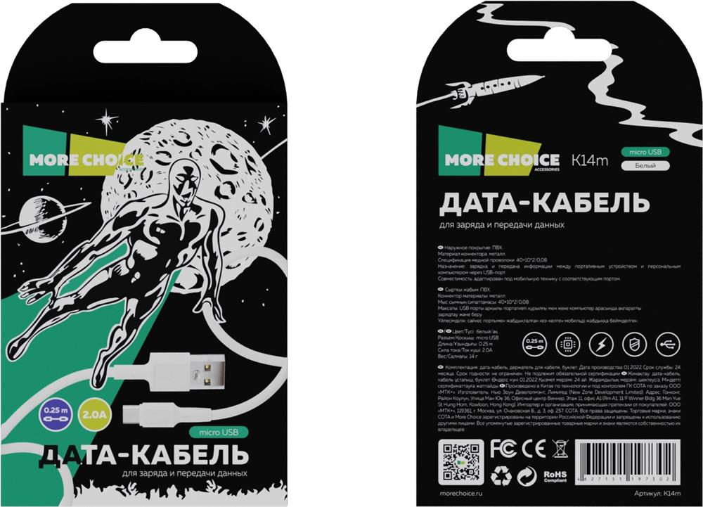 Дата-кабель USB 2A для micro USB More choice K14m 0,25м Разъем: micro USB Совместимость: адаптирован под любую мобильную технику, оснащенную портом micro USB Длина: 0,25 м Сила тока: 2.0А Наружное покрытие: ПВХ Материал коннектора: металл Спецификация медной проволоки: 40+10*2/0,08 Назначение: зарядка и передача информации между портативным устройством и персональным компьютером через USB-порт. Вес: 14 г Комплектация: дата-кабель micro USB 2.0А, держатель для кабеля, буклет. Размер упаковки: 85*150*16 Цвета: Black, White