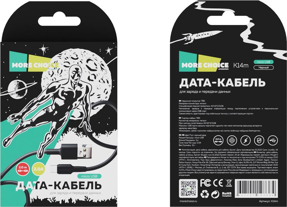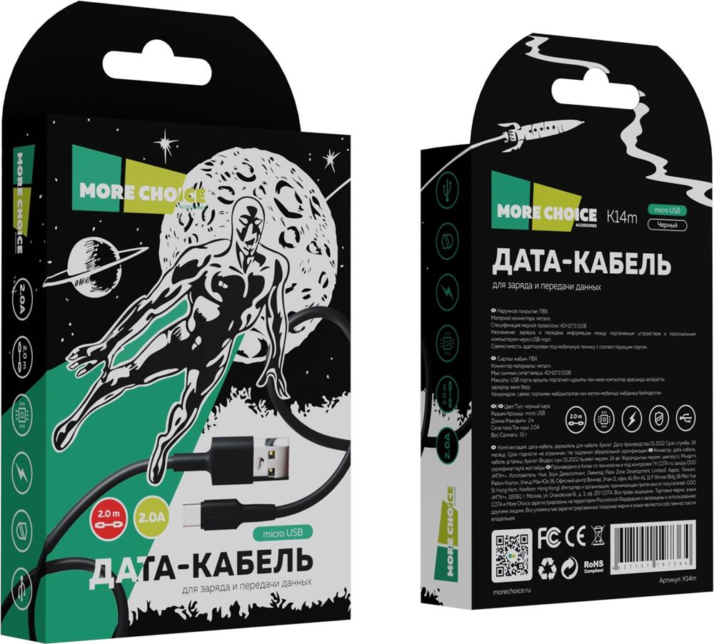 Дата-кабель USB 2A для micro USB More choice K14m 2м Разъем: micro USB Совместимость: адаптирован под любую мобильную технику, оснащенную портом micro USB Длина: 2 м Сила тока: 2.0А Наружное покрытие: ПВХ Материал коннектора: металл Спецификация медной проволоки: 40+10*2/0,08 Назначение: зарядка и передача информации между портативным устройством и персональным компьютером через USB-порт. Вес: 51 г Комплектация: дата-кабель micro USB 2.0А, держатель для кабеля, буклет. Размер упаковки: 85*150*16 Цвета: Black, White