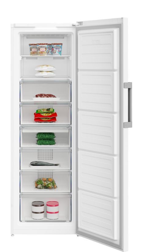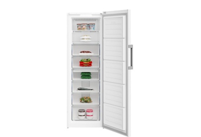 Вертикальный морозильник. Размеры (ВхШхГ), см: 185х59,5х65. Общий объем 312 л. Полезный объем 275 л. 1 компрессор (R600a). No Frost. Электронное управление, Электронное Display на двери. Авто.разморозка. Быстрая заморозка Quick Freeze. Технология FreezerGuard. Время сохранения t°C без электричества: 18 ч. Уровень шума: 39 дБ. Перенавешиваемая дверца. Внутреннее освещение. Внешняя ручка. Cигнал открытой двери, 6 ящиков, 7 полки, лоток для льда, лоток для пельменей. Мощность замораживания: 16 кг/24 ч. Климатический класс: SN-T. Класс энергетической эффективности: А+. Энергопотребление в год: 324 кВт/ч. Цвет: Белый