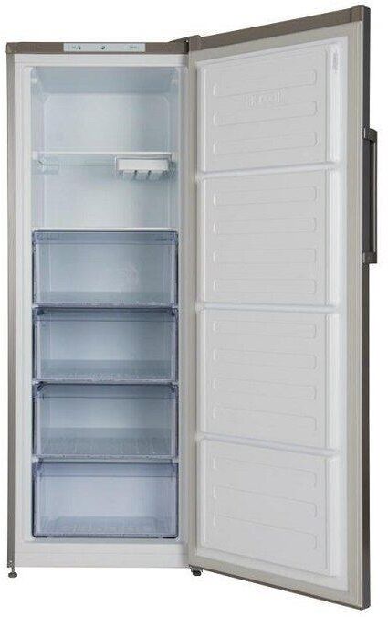 Вертикальный морозильник. Размеры (ВхШхГ), см: 150х54х60. Общий объем 215 л. Полезный объем 213 л. 1 компрессор (R600a). Электронное управление, внутренний дисплей. Ручная разморозка. Быстрая заморозка Quick Freeze. Время сохранения t°C без электричества: 22 ч. Уровень шума: 40 дБ. Перенавешиваемая дверца. Внешняя ручка. Антибактериальное покрытие резинового уплотнителя. Cигнал открытой двери, 4 ящика, стеклянные полки (закален. стекло): 5, лоток для льда. Мощность замораживания: 9 кг/24 ч. Климатический класс: SN-ST. Класс энергетической эффективности: А. Энергопотребление в год: 322 кВт/ч. Цвет: серебристый.