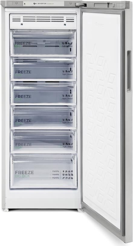 Морозильник с функцией холодильника; Габариты ШхВхГ, см: 60х145х62,5; Цвет: Металлик; Количество компрессоров: 1; Дисплей; Объем морозильной камеры: 230 л; Общий полезный объем: 160 л; Инверторный компрессор; Управление: Электронное; Количество камер: 1; Система Full No Frost; Мощность замораживания: 14 кг/сутки; Класс энергоэффективности: A+; Возможность перевешивания двери; Автономное сохранение холода: 12 ч; Минимальная температура в морозильной камере: -20 °C; Сигнализация повышения температуры в морозильной камере; Количество ящиков в морозильном отделении: 6; Блокировка от детей; Режим "Быстрая заморозка"; Суточный расход электроэнергии, при температуре окружающего воздуха 24°C: 67 кВтч; Индикация