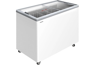 Ларь со стеклянными сдвижными дверцами, плоская форма стекла. Общий объем 330 л, полезный объем 260 л. Климатический класс: ST. Класс энергоэффективности B, Потребление 949 кВтч/год, , механическое управление, Хладагент R290, Температурный режим от -18°С