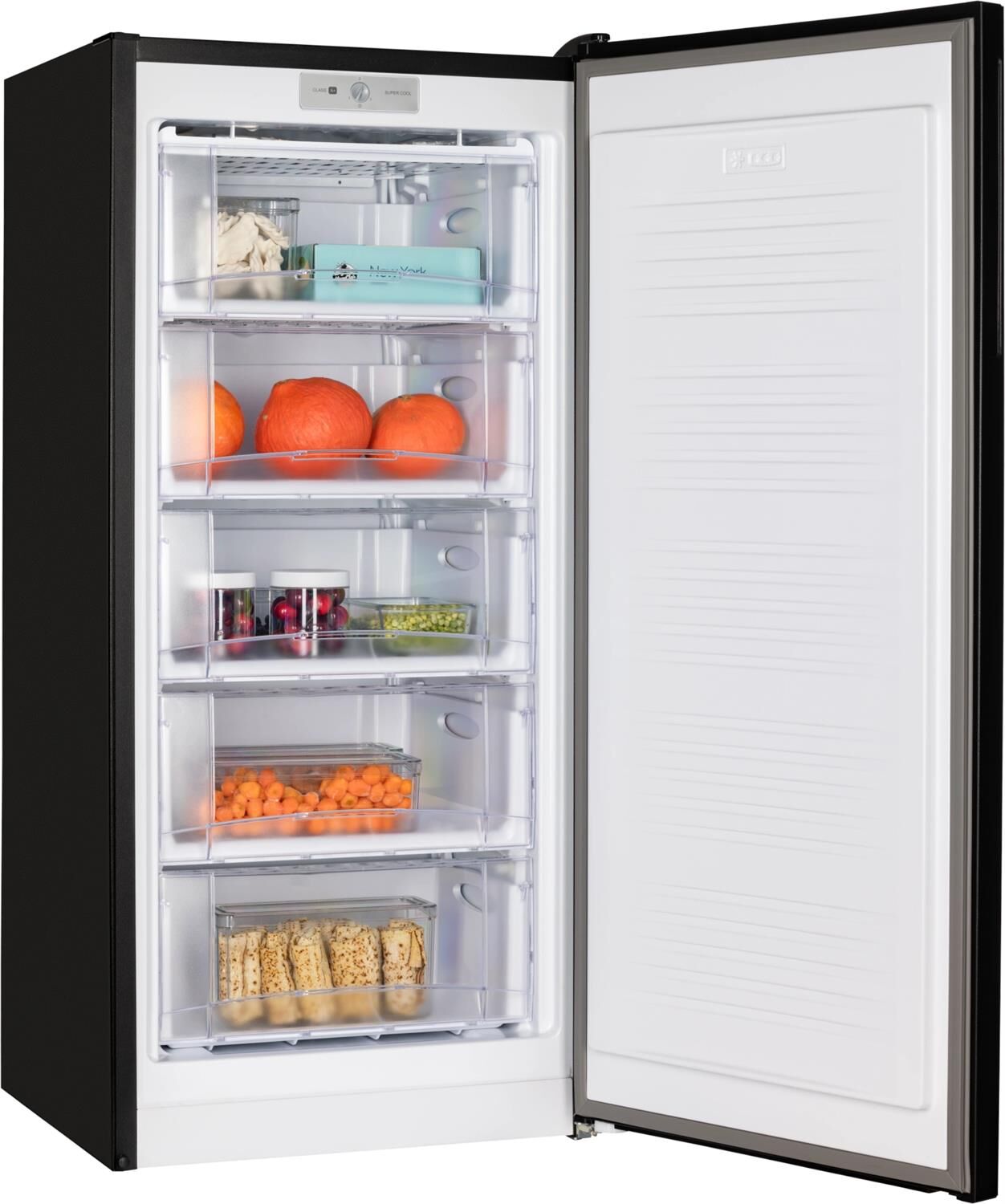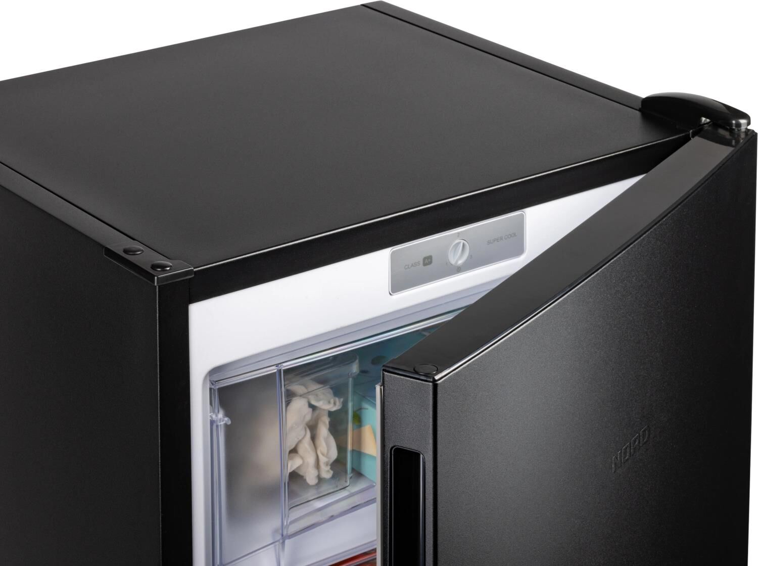 175 л, класс А+, 5 секции МК, 5 выдвижных ящика из пластика, новые вертикальные ручки, съемный уплотнитель двери, 128х57х63 см, цвет: черный матовый