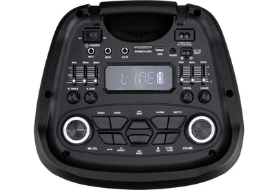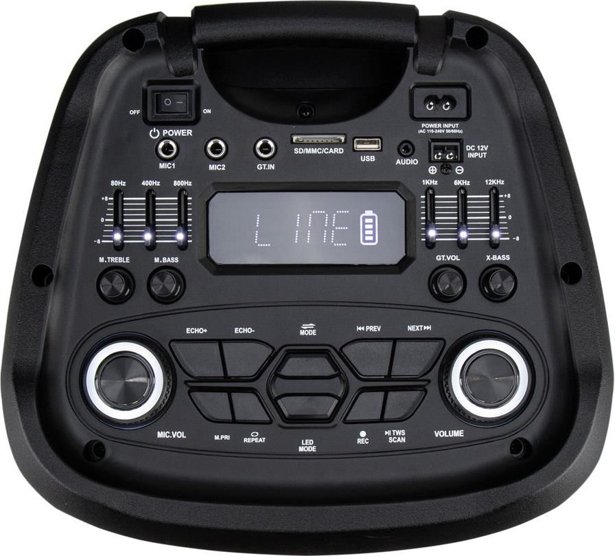 "Режимы воспроизведения: - Bluetooth - FM - Внешний накопитель - Aux Мощность: - RMS 120 Ватт - PMPO 1200 Ватт Питание: - 220V - Встроенный аккумулятор 12В 7А (до 5 часов работы) Разъемы: - USB - MicroSD - AUX - Jack 6.3 мм (микрофон-гитара) 3 шт. Комплектация: - Колонка - Кабель питания - Беспроводной микрофон - 2 шт - Пульт ДУ - Инструкция - Кабель AUX 3.5mm Размеры упаковки: Ширина - 40 см Высота - 87 см Глубина - 34 см Вес брутто: 19 кг Дополнительно: LED подсветка Регулировка громкости микрофона Дисплей Приоритет микрофона Регулировка эхо микрофона Удобная ручка для переноски Встроенный эквалайзер Колесики для перемещения"