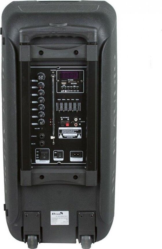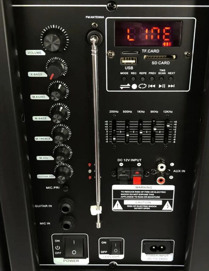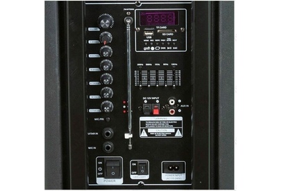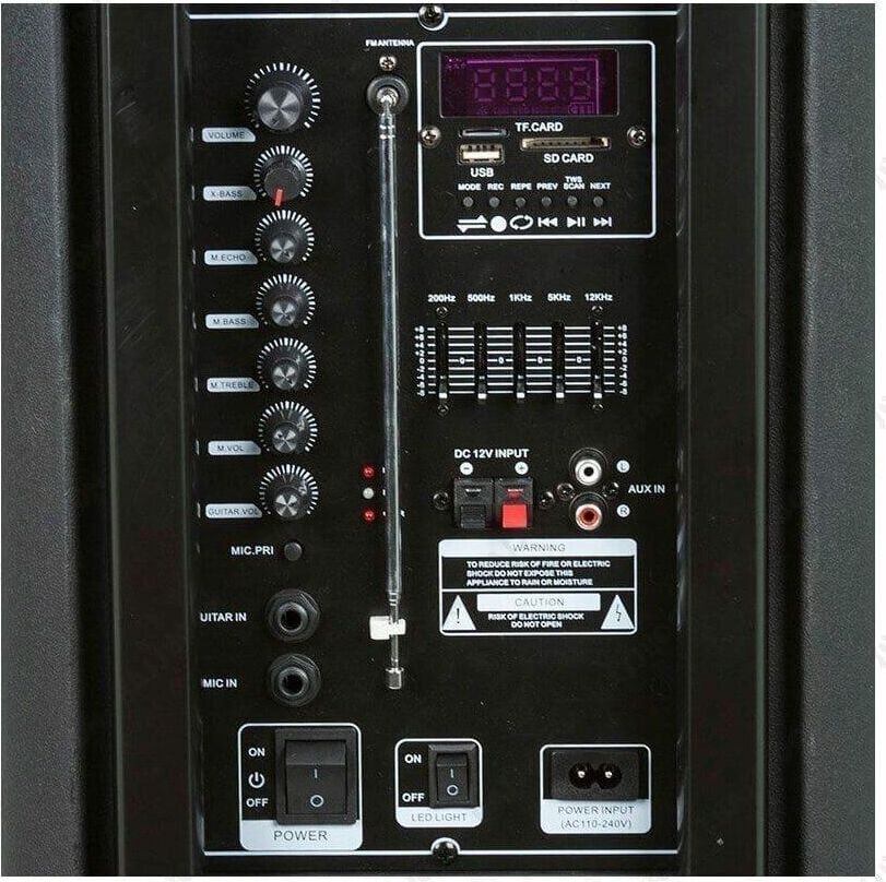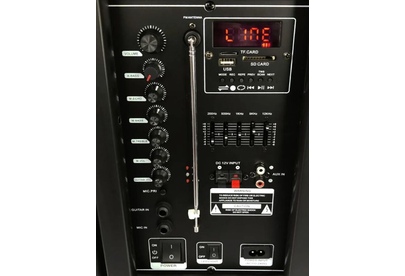 акустическая колонка, Режимы воспроизведения: Bluetooth, Внешний накопитель, Aux, FM, Мощность: номинал 80 Ватт, пик 100 Ватт, Питание: Сеть 220V, Встроенный аккумулятор 7000 mAh (до 5 часов работы), Разъемы: USB, SD, AUX, Jack 6.3 мм (микрофон, гитара) 2 шт., mini-Jack 3.5мм, Audio input 2х канальный, Комплектация: Микрофон беспроводной 2 ш., Пульт Д/У, Кабель питания 220V, Кабель подключения 12V, Размер: 34х72х33 см, Дополнительно: Дисплей, Кнопка вкл/выкл подсветки, Индикатор заряда батареи, Регулировка низких и высоких частот, LED посветка динамика (активная), Телескопическая ручка для перемещения, Колесики, Возможность подключения дополнительного аккумулятора 12 V, Встроенный эквалайзер, - TWS функция (синхронизация двух колонок в стерео систему через Bluetooth)