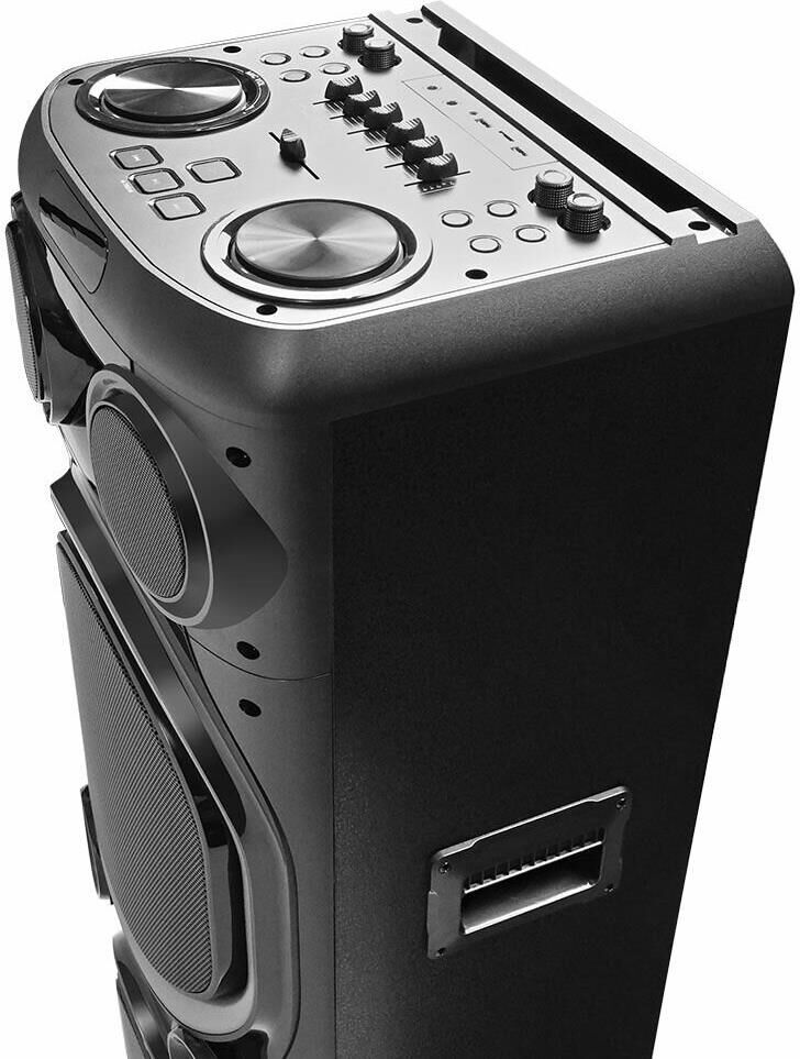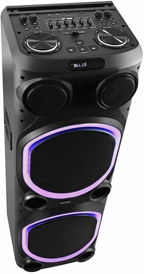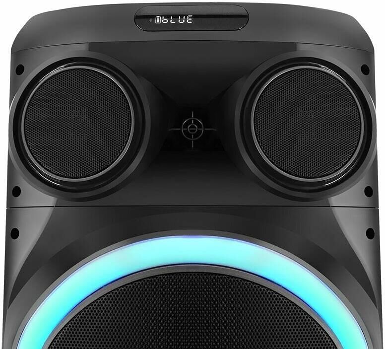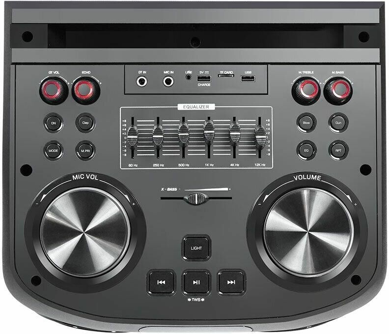 Выходная мощность - 200Вт. ДИНАМИКИ: НЧ-2х12 дюймов, СЧ-1х4 дюйма, ВЧ-1х1 дюйм. Поддержка режима TWS. Функция Х-басс. Регулировка высоких и низких частот. КАРАОКЕ функция - 6.5мм микрофон. Аудиовход для гитары. ДИНАМИЧЕСКАЯ RGB подсветка динамиков. ЭКВАЛАЙЗЕР: 6-ти полосный. ЭКВАЛАЙЗЕР программный: POP, ROCK, JAZZ, CLASSIC, FLAT. Аккумулятор 12V /9000 мАч и питание от сети 220V. FM РАДИО: 87,5-108,0 МГц. АУДИО-ПЛЕЕР: USB-flash и микро SD-card. AUX: DC-jack 3,5 мм. Пульт дистанционного управления. Диапазон воспроизводимых частот - 45 Hz - 20 kHz.