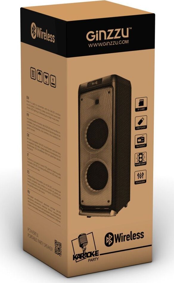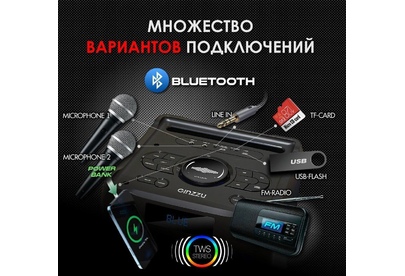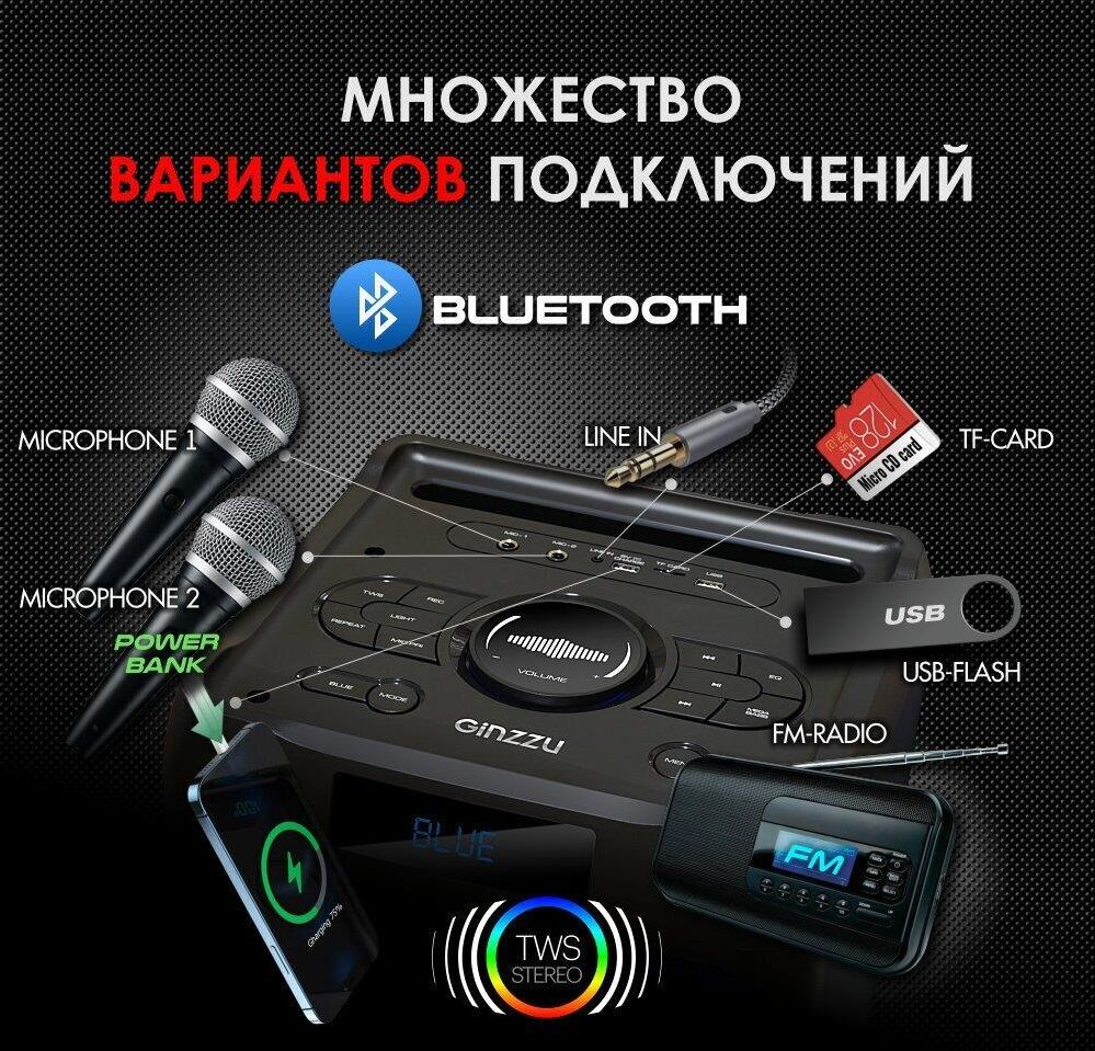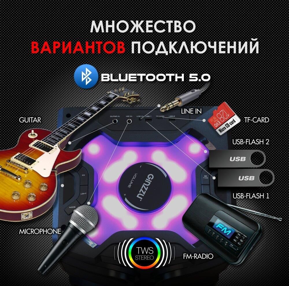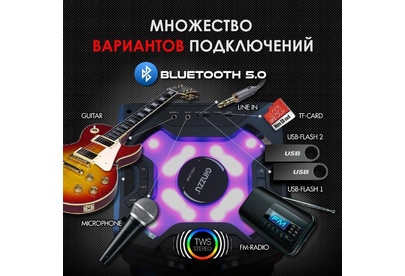 MIDI-система, Bluetooth , выходная мощность (RMS) - 120Вт., динамики НЧ/СЧ - 2 х 8 дюймов, ВЧ - 1 х 2 дюйма, МEGABASS - функция увеличения низких частот., КАРАОКЕ функция - два микрофона. ДИНАМИЧЕСКАЯ RGB подсветка динамиков - 7 режимов.ЭКВАЛАЙЗЕР.Аккумулятор 12V /7500 мАч и питание от сети 220V. Bluetooth: V4.2.Поддержка режима TWS.Функция POWERBANK (USB - 5V). FM РАДИО: 87,5-108,0 МГц.АУДИО-ПЛЕЕР: USB-flash и микро SD-card. AUX: DC-jack 3,5 мм.Пульт дистанционного управления.Диапазон воспроизводимых частот - 50 Hz - 18 kHz.