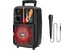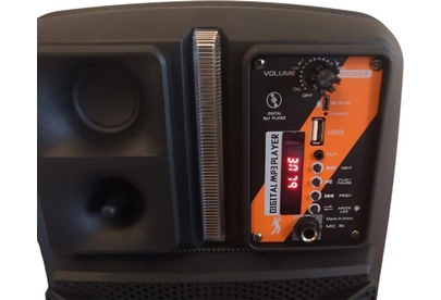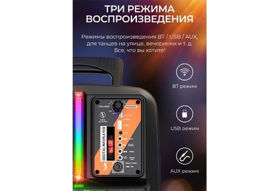 Спикер: 8 дюймов 2Ом 15W. Аккумулятор: 1800mAh, класс A, 18650. BT спецификация: BT V5.0 Zhongke Blue Flood. Функции: поддержка BT проигрывания / BT TWS соединения, FM, USB, AUX режимов проигрывания, вход для проводного микрофона. Поддержка переключения подсветки. Зарядное напряжение: DC 5V, время зарядки около 2.5 часов. В режиме музыки: около 3 часов (при громкости 80%). Размеры: 592*510*388 мм. Вес: 1.9 кг.