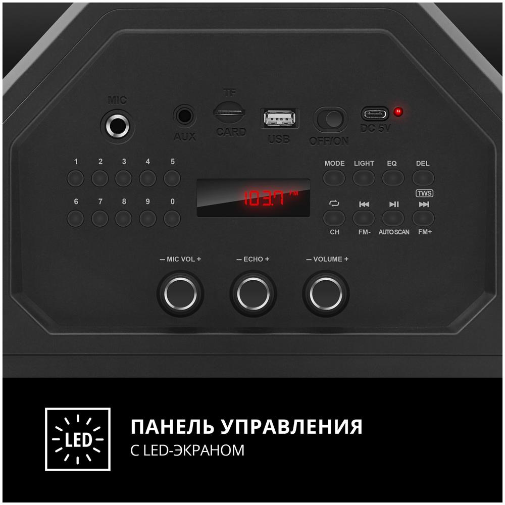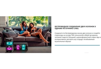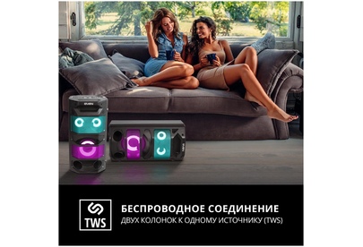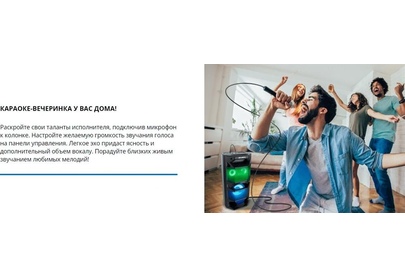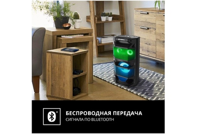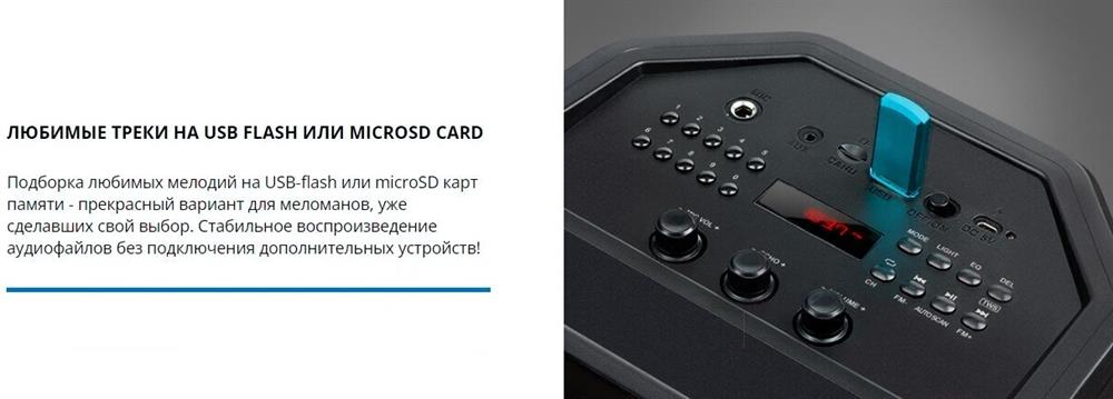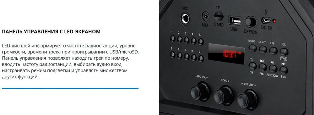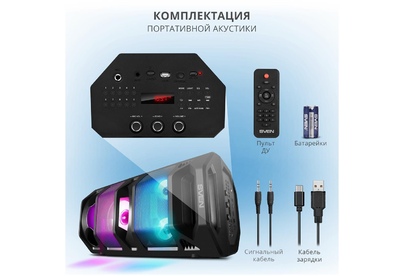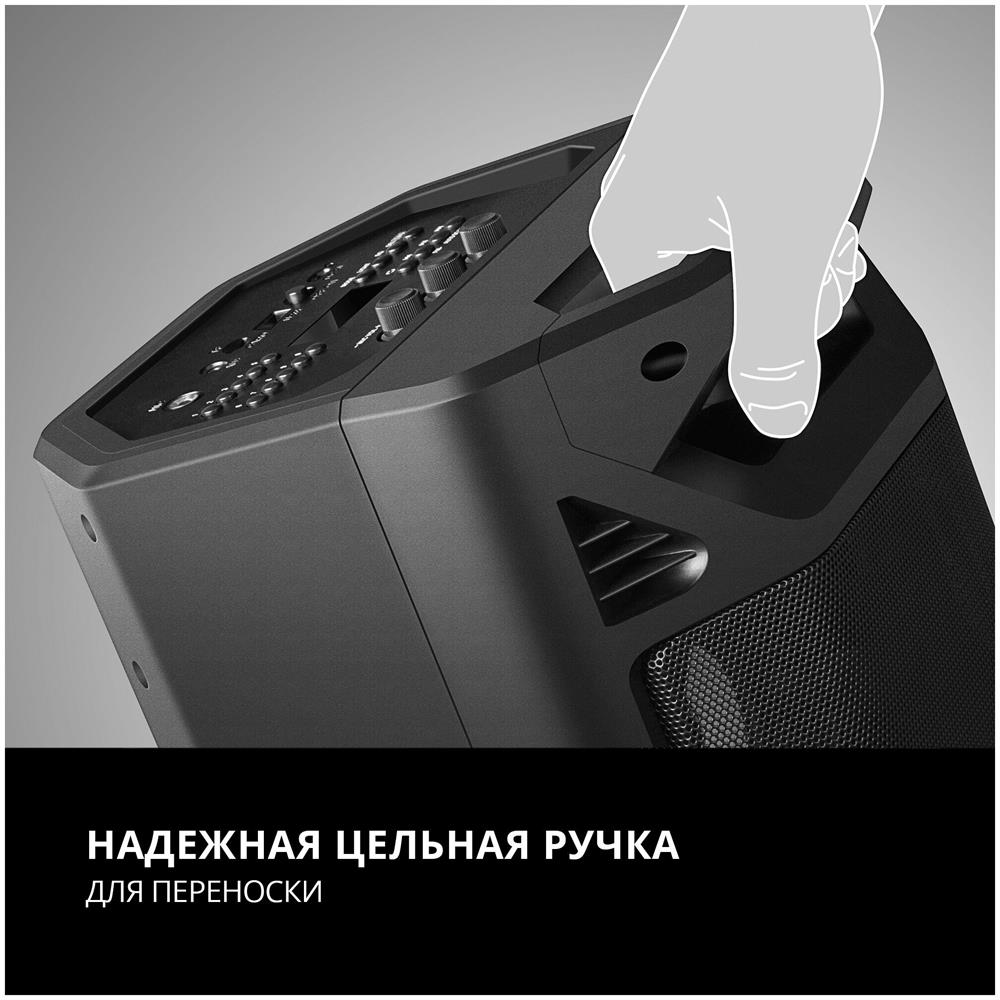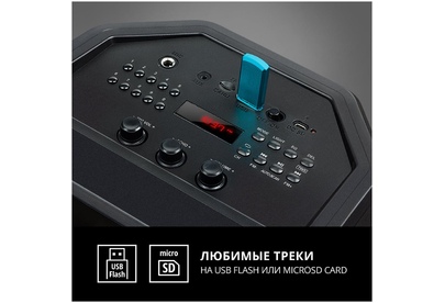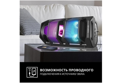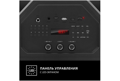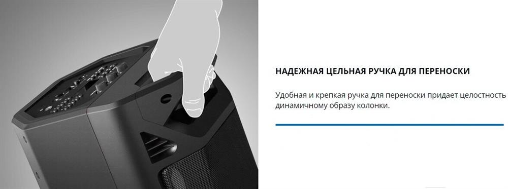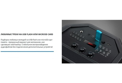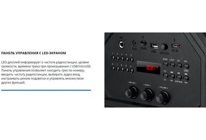 Выходная мощность (RMS), Вт 65 (2 x 32.5) Частотный диапазон, Гц 45 – 22 000 Диапазон частот тюнера, МГц 87.5 – 108 Размеры динамиков, мм ВЧ: O 70, НЧ: O 140 Беспроводная передача сигнала по Bluetooth да Воспроизведение музыки с носителей памяти USB, microSD Источник питания литий-ионный aккумулятор: 4400 мA · час (2 шт.) / USB: DC 5 V Тип соединения Bluetooth, проводной Радиус действия, м до 10 Размеры изделия, мм 470 ? 240 ? 240 Вес, кг 4,15 Цвет черный