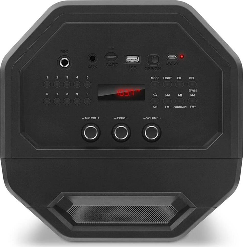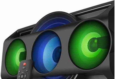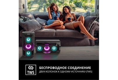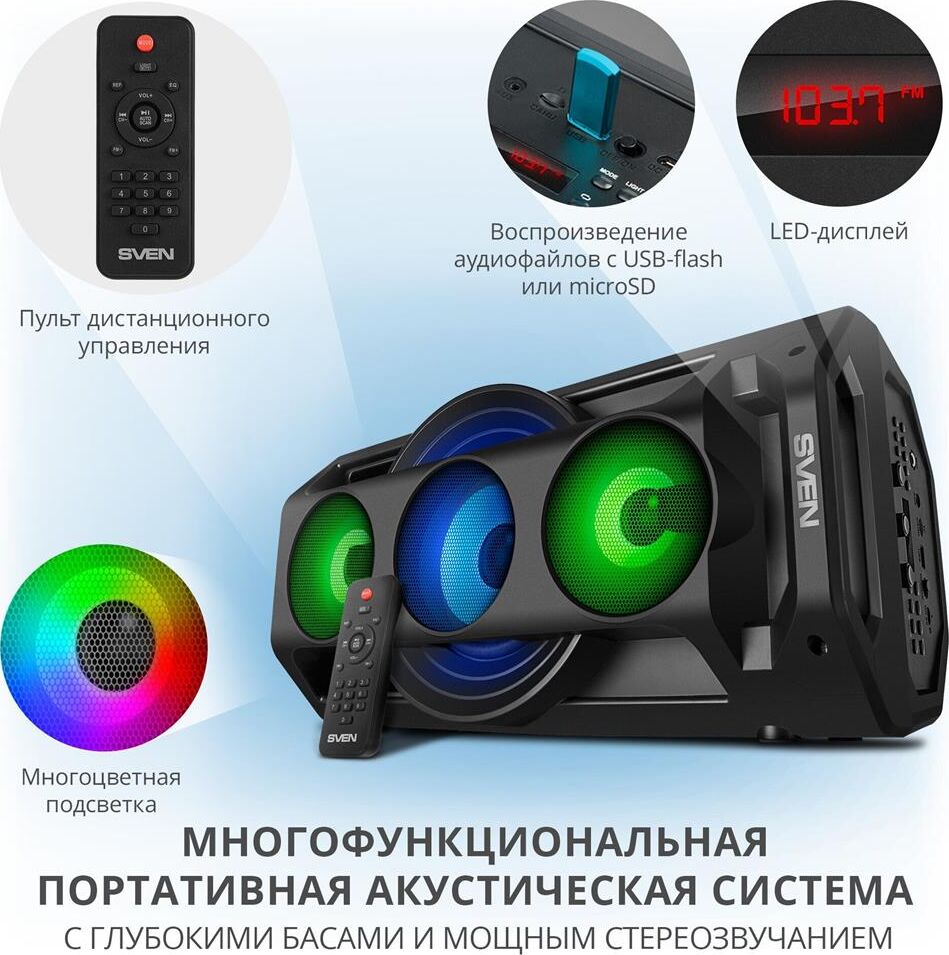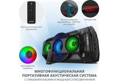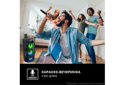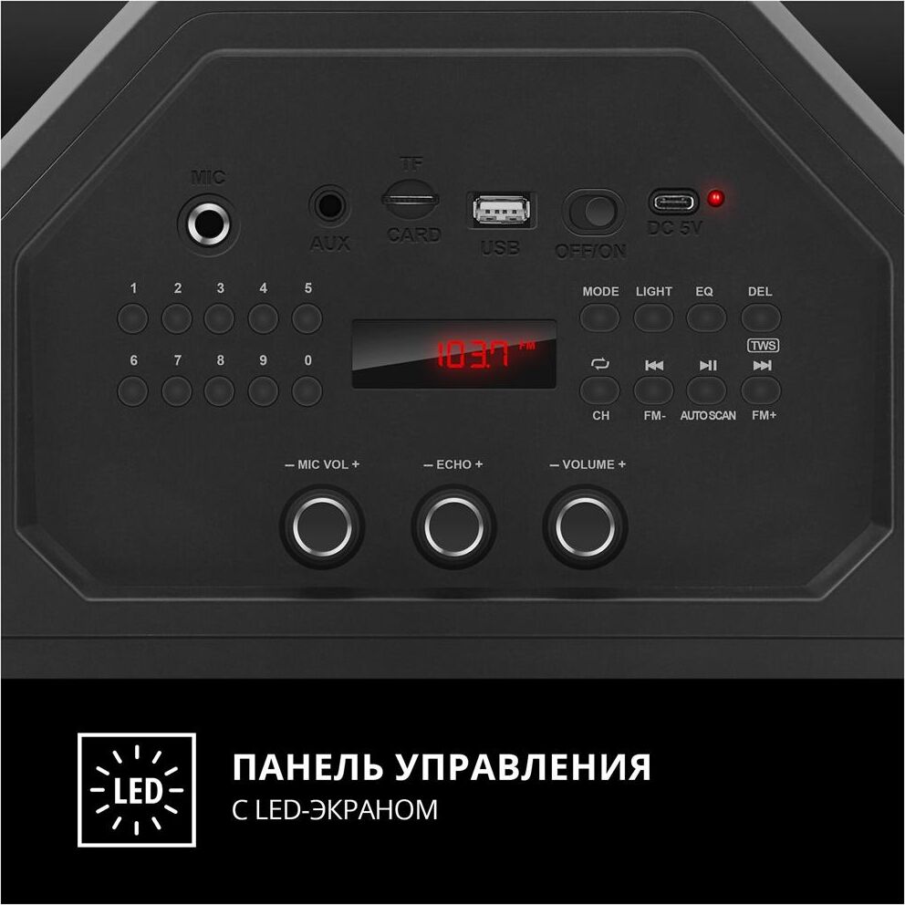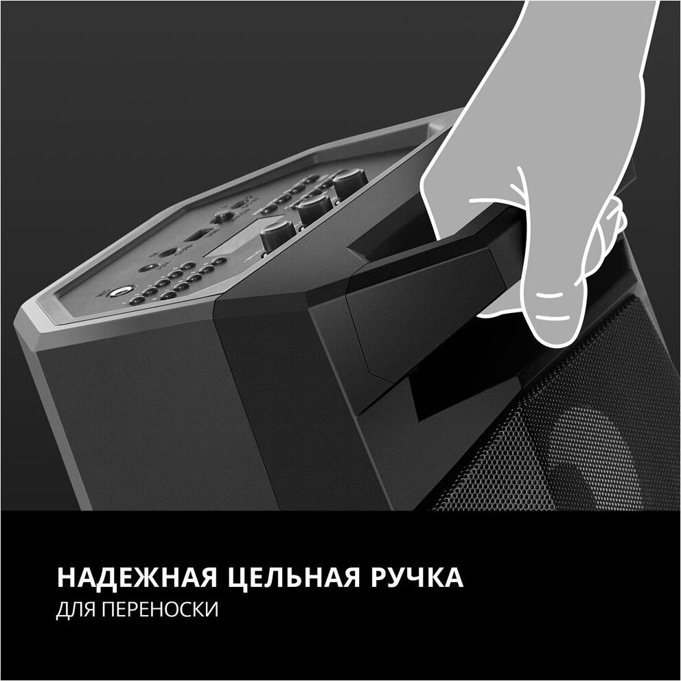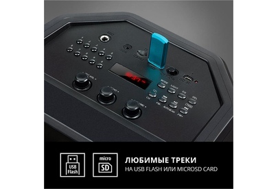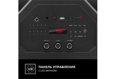 Многофункциональная портативная акустическая система с подсветкой, Bluetooth, LED-дисплей, встроенный эквалайзер, встроенное FM-радио, выходная мощность (RMS), Вт 65 (2 x 32.5), частотный диапазон, Гц 45 – 22 000, диапазон частот тюнера, МГц - 87.5 – 108, размеры динамиков, мм - ВЧ: O 70, НЧ: O 140, воспроизведение музыки с носителей памяти USB, microSD, источник питания литий-ионный aккумулятор: 4400 мA · час (2 шт.) / USB: DC 5 V, тип соединения Bluetooth, проводной, радиус действия, м - до 10, размеры изделия, мм 470 х 240 х 240, вес - 4,35 кг.