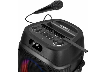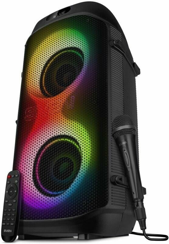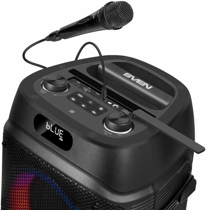 Выходная мощность 100 Вт . Приложение «SVEN SOUND» для управления портативной акустикой. Передача сигнала по Bluetooth Динамическая отключаемая RGB подсветка Беспроводное подключение двух колонок к одному источнику звука (TWS) Микрофонный вход для караоке Регулировка уровня эха караоке микрофона Аудиовход для подключения электрогитары .Проводной микрофон в комплекте Быстрое подключение по Bluetooth с помощью NFC FM-радио. LED дисплей Воспроизведение музыки с USB flash и microSD карт памяти Ручка для переноски Время работы до 28 часов Встроенная подставка для смартфона Вход AUX для подключения источника звука Функция эквалайзера Возможность горизонтального и вертикального расположения Пульт ДУ . Литий-ионный aккумулятор: 7.4В, 8000мА*ч