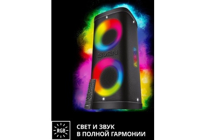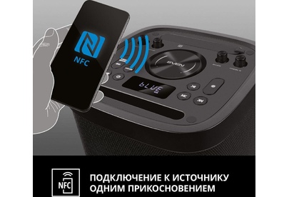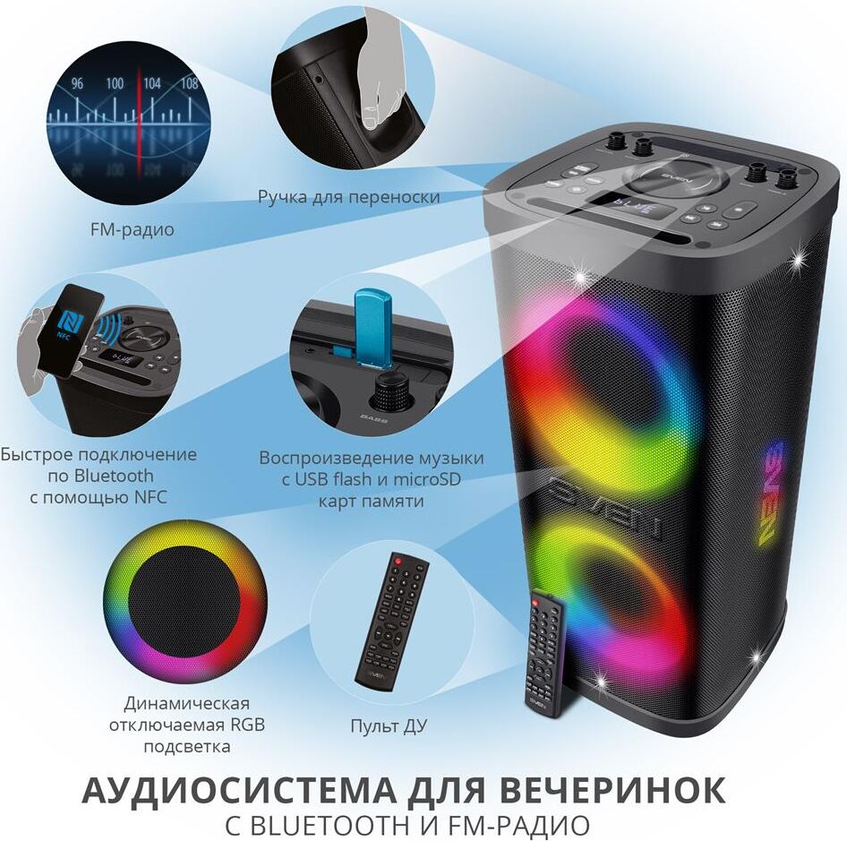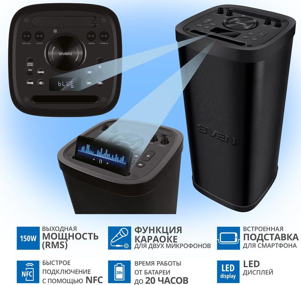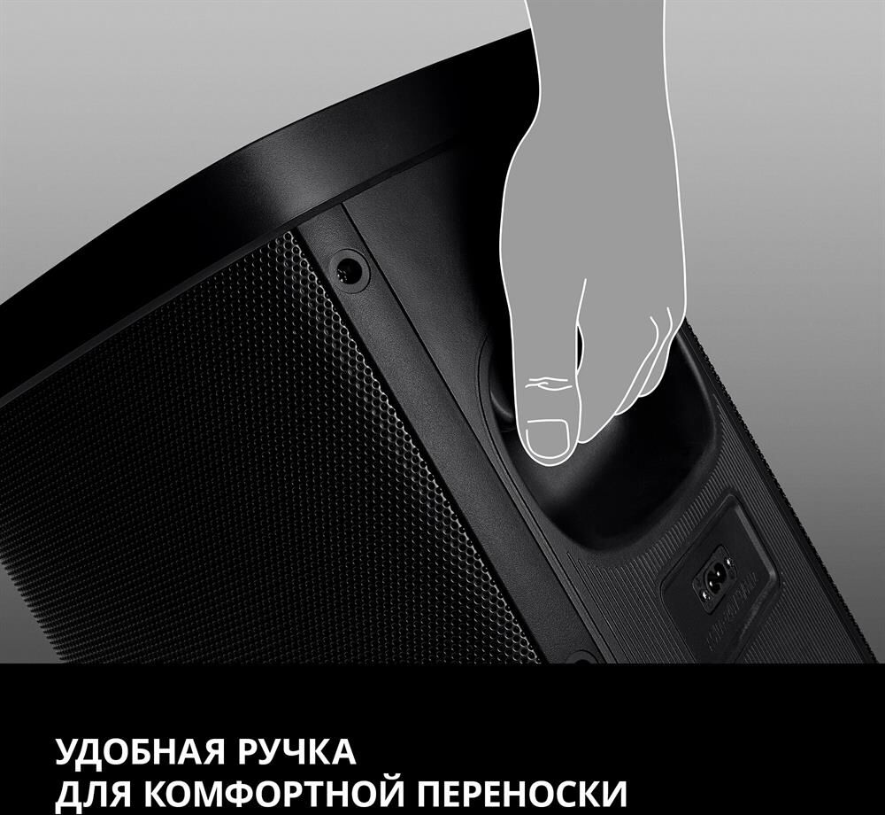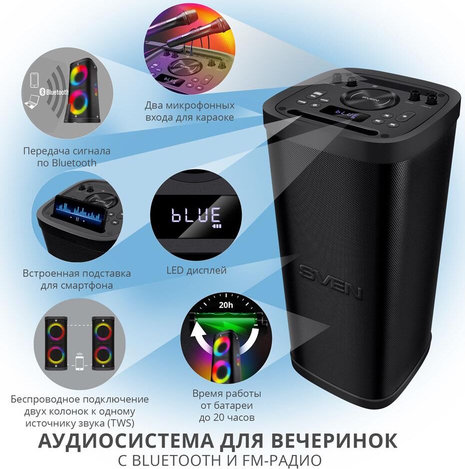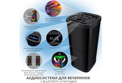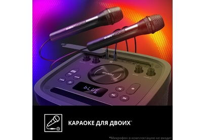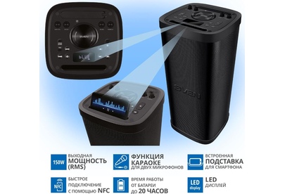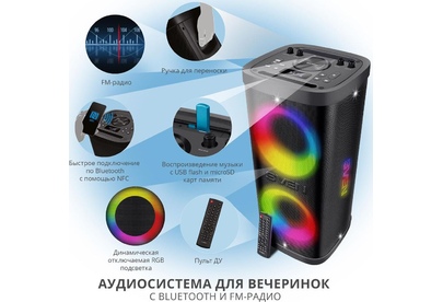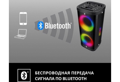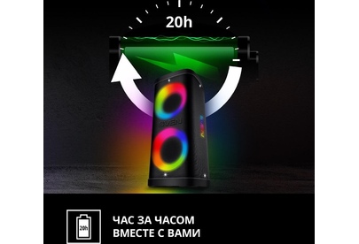 Выходная мощность 150 Вт Передача сигнала по Bluetooth Динамическая отключаемая RGB подсветка Беспроводное подключение двух колонок к одному источнику звука (TWS) Два микрофонных входа для караоке Регулировка уровня эха караоке микрофона FM-радио* Быстрое подключение по Bluetooth с помощью NFC** LED дисплей Воспроизведение музыки с USB flash и microSD карт памяти Стробоскоп Ручка для переноски Время работы от батареи до 20 часов Встроенная подставка для смартфона Вход AUX для подключения источника звука Функция эквалайзера Пульт ДУ Функция усиления баса