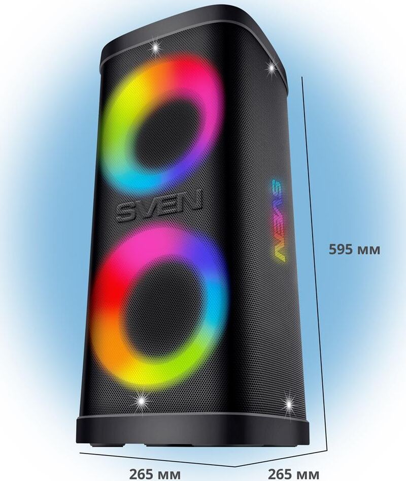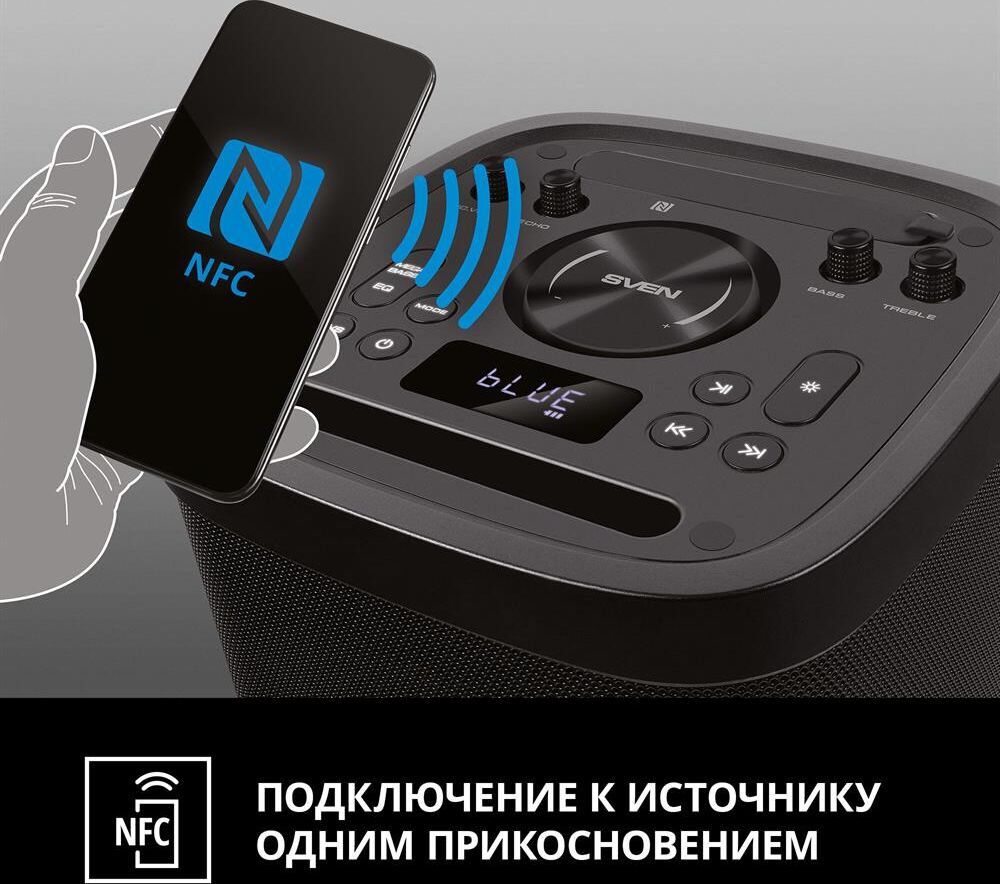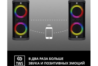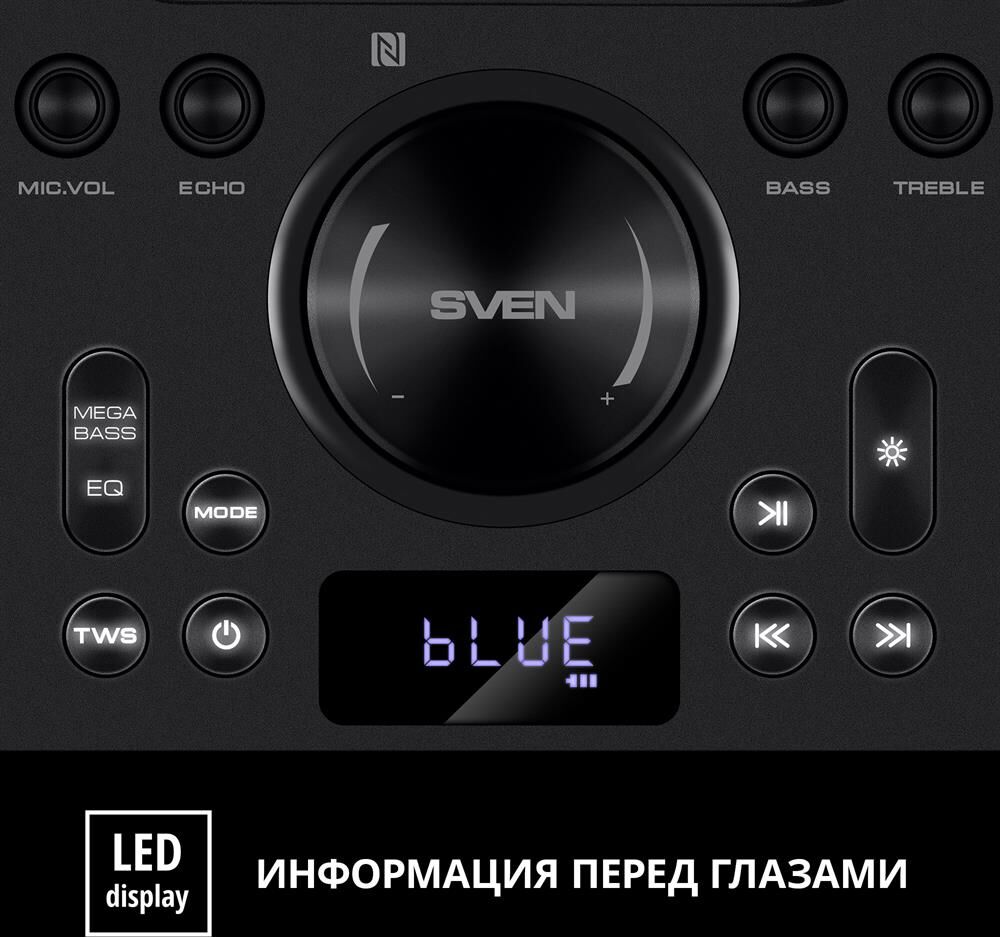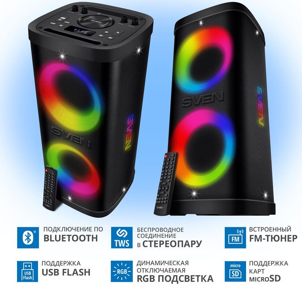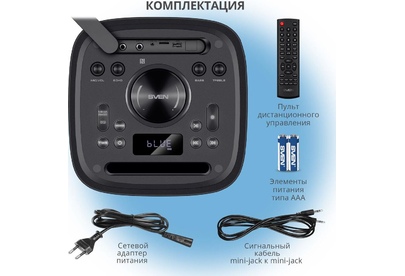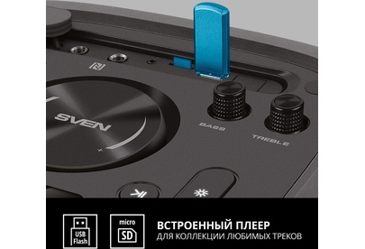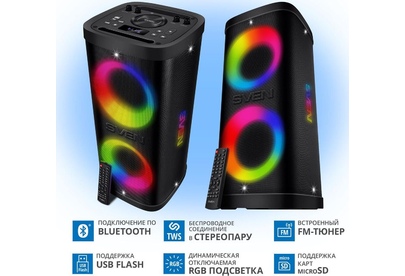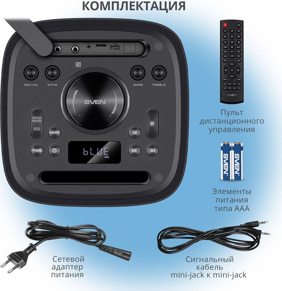 Выходная мощность 150 Вт Передача сигнала по Bluetooth Динамическая отключаемая RGB подсветка Беспроводное подключение двух колонок к одному источнику звука (TWS) Два микрофонных входа для караоке Регулировка уровня эха караоке микрофона FM-радио* Быстрое подключение по Bluetooth с помощью NFC** LED дисплей Воспроизведение музыки с USB flash и microSD карт памяти Стробоскоп Ручка для переноски Время работы от батареи до 20 часов Встроенная подставка для смартфона Вход AUX для подключения источника звука Функция эквалайзера Пульт ДУ Функция усиления баса