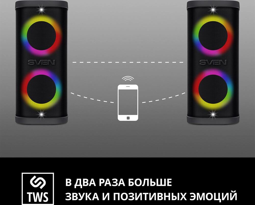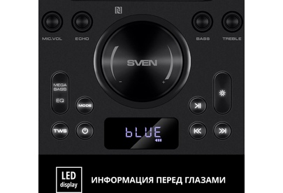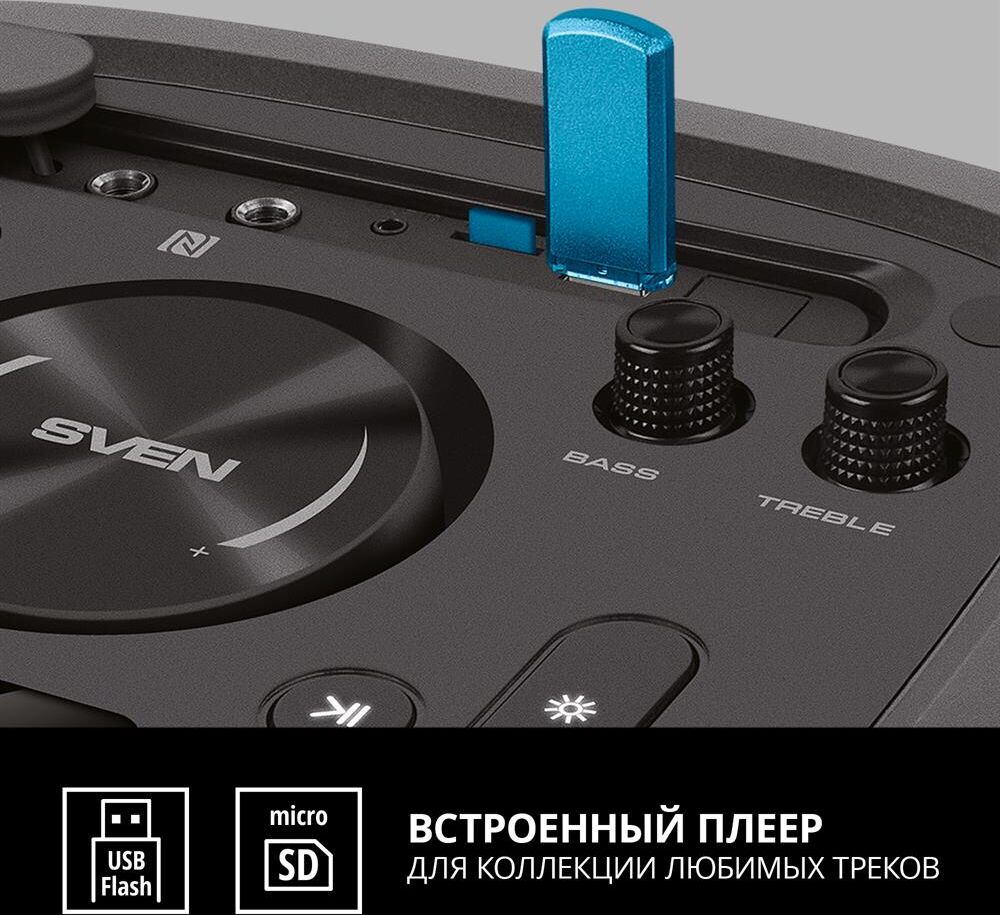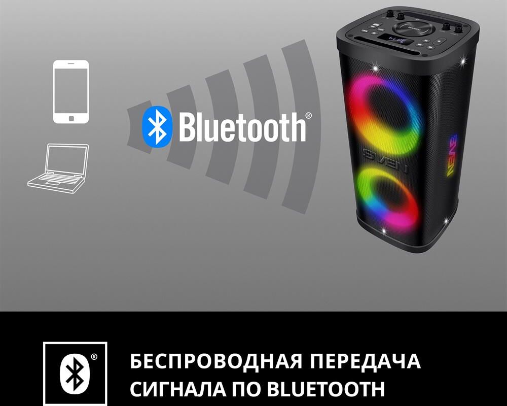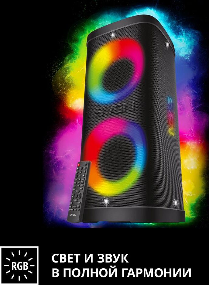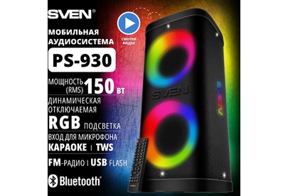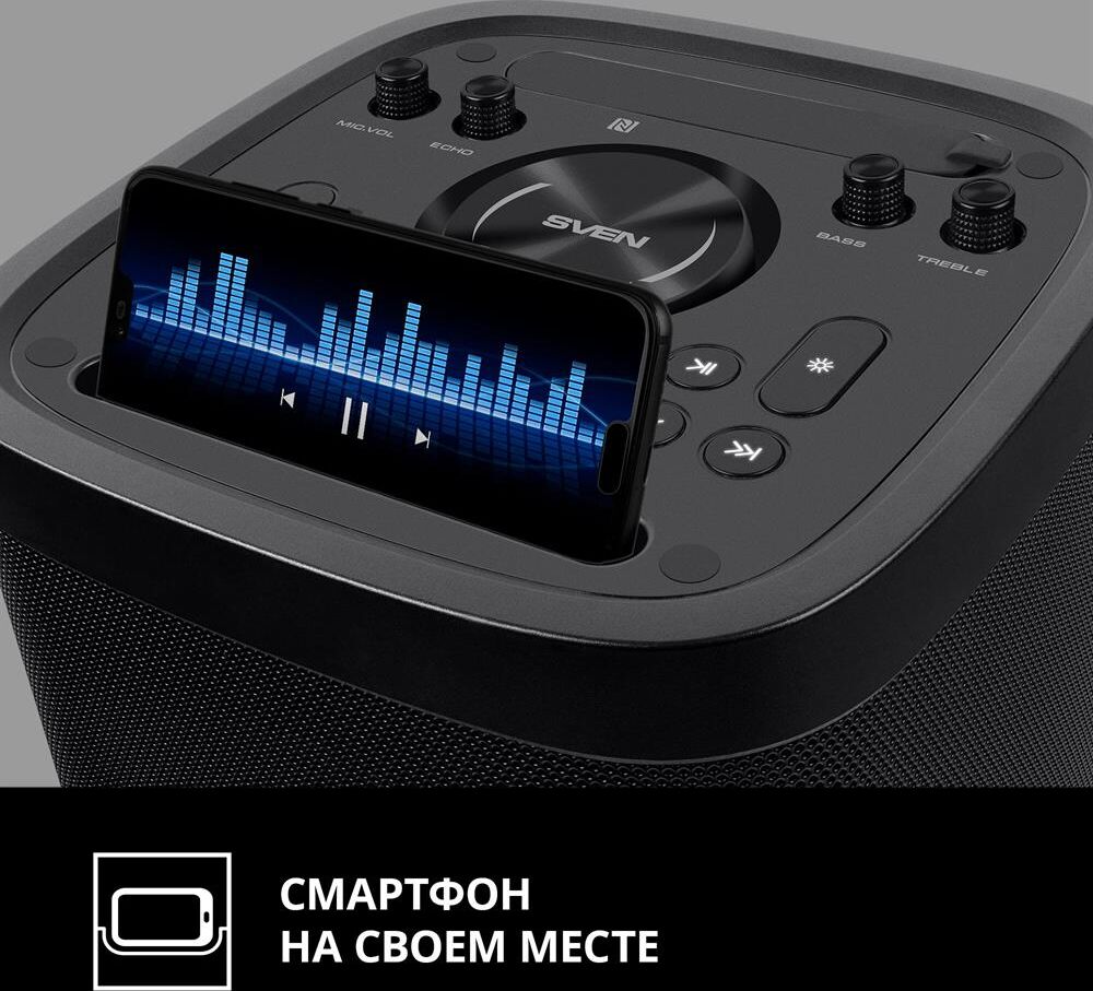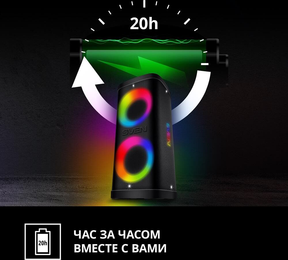 Выходная мощность 150 Вт Передача сигнала по Bluetooth Динамическая отключаемая RGB подсветка Беспроводное подключение двух колонок к одному источнику звука (TWS) Два микрофонных входа для караоке Регулировка уровня эха караоке микрофона FM-радио* Быстрое подключение по Bluetooth с помощью NFC** LED дисплей Воспроизведение музыки с USB flash и microSD карт памяти Стробоскоп Ручка для переноски Время работы от батареи до 20 часов Встроенная подставка для смартфона Вход AUX для подключения источника звука Функция эквалайзера Пульт ДУ Функция усиления баса