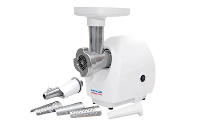максимальная мощность 1500 Вт, номинальная мощность 230 Вт, производительность — 50 кг/час, Насадки насадка для приготовления колбас, диск для фарша Диск для фарша 2 в комплекте, диаметр отверстий 4.9 мм Соковыжималка шнековая Материал лотка пластик Материал корпуса пластик Можно мыть в посудомоечной машине Прорезиненные ножки Вес 3,5 кг Цвет белый