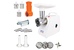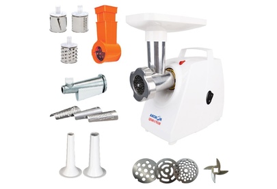 Габариты 0,30 х 0,19 х 0,40 Вес 4,9 кг. Мощность1500 Вт Производительность 1,66 кг/мин Материал Пластик Защита двигателя от перегрузки; Удобное хранение ножа и решеток; 3 вида решеток для получения фарша разной консистенции - с диаметром отверстий 4,9 мм и 7 мм, а также овальными отверстиями; Высокое размещение шнековой камеры; Ручка для переноски; Устойчивые нескользящие ножки для фиксации мясорубки на поверхности стола