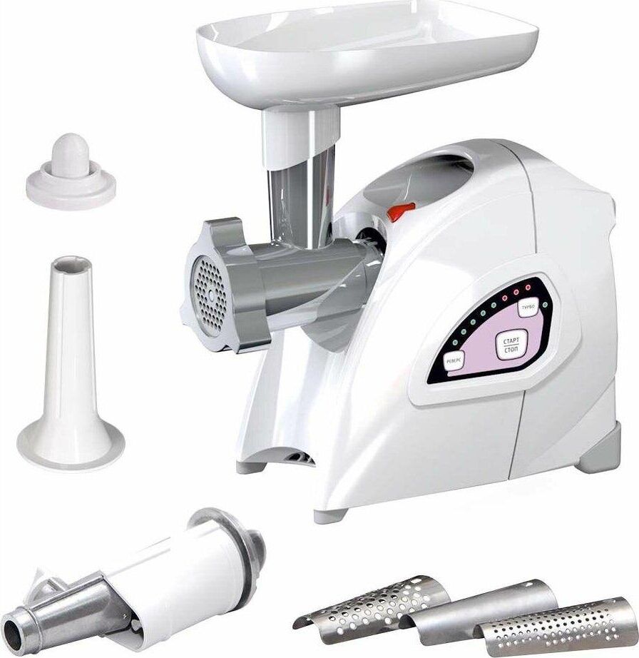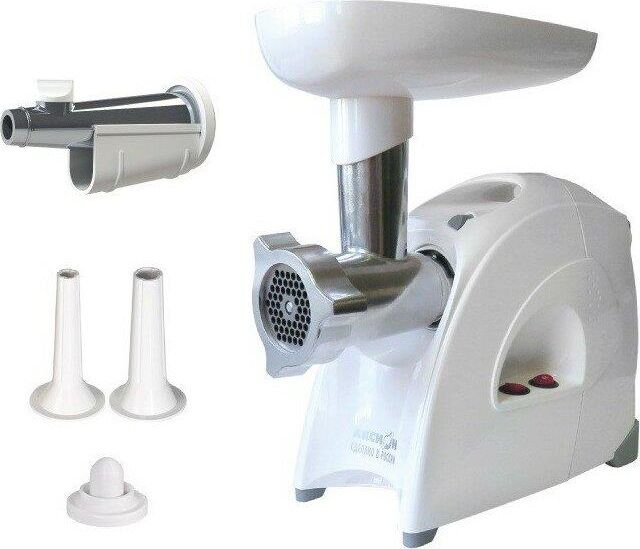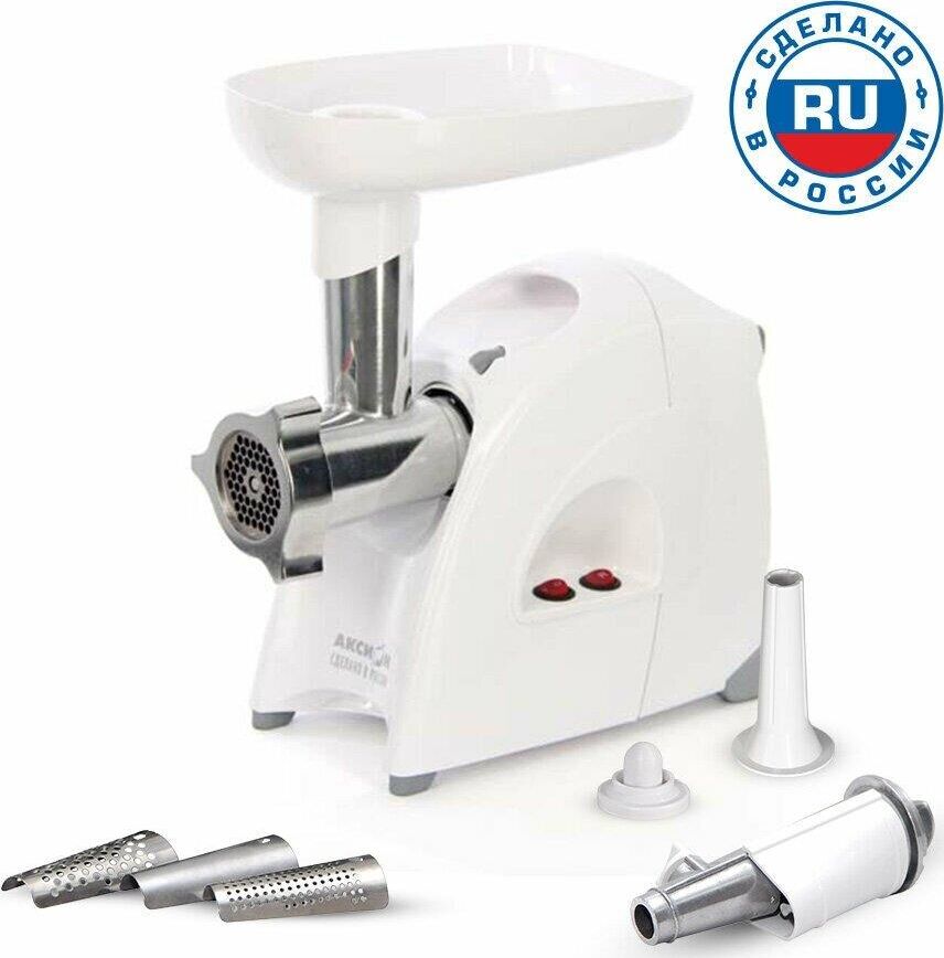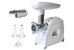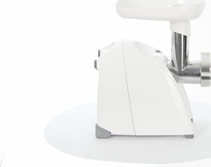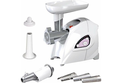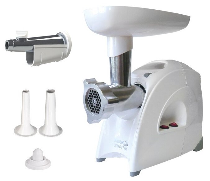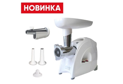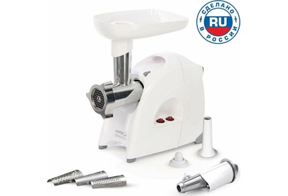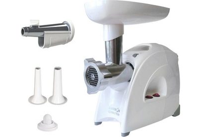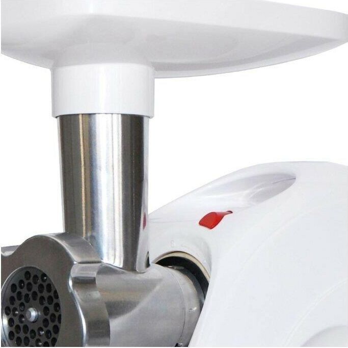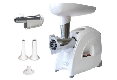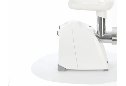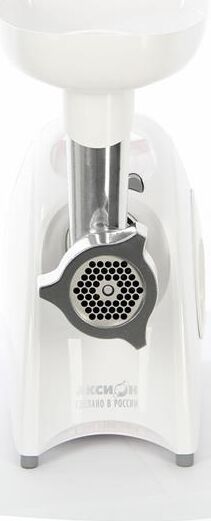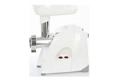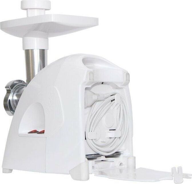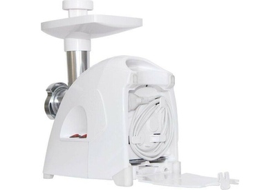 Номинальная потребляемая мощность 300 Вт. Материал корпуса пластик. Панель управления механическая. Длина провода 1,5 м. Материал ножей нержавеющая сталь. Производительность 4 кг/мин. Реверс. Мощность 2000 Вт. Цвет белый. Производительность — до 3 кг фарша в минуту. Двойная защита от перегрузки. Функция «реверс» для предотвращения наматывания жилок на шнек. Отсек в корпусе для шнура питания, хранения ножа и насадок. Особая заточка ножа и решетки увеличенной толщины из нержавеющей стали, обеспечивающие высокое качество фарша из всех видов мяса и других продуктов. До 30 минут непрерывной работы. 2 вида решеток для получения фарша разной консистенции - с диаметром отверстий 4,9 мм и 8,5 мм. Высокое размещение шнековой камеры. Эргономичная гайка для удобной сборки/разборки мясорубки. Ручка для переноски. Устойчивые нескользящие ножки для фиксации мясорубки на поверхности стола. Возможность вертикального хранения для экономии пространства на кухне.